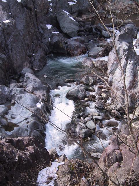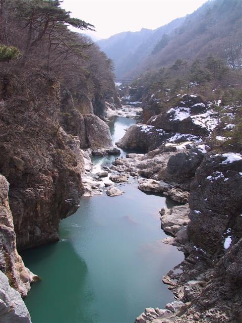 川治温泉へは、龍王峡という渓谷を見ながら歩いていくことにした。写真で見ると、あまりその大きさや高さを感じることができないものだけど、この渓谷はかなり深く険しい。翡翠色(緑色って書くとなんか汚そう)の水面と、白っぽい岩と残雪のバランスがなかなか美しい。でも、本当は紅葉の季節が良いみたい。これに、紅葉の赤い色が加われば、確かにいいバランスになりそうだ。今の季節だと、ちょっと暗い感じ。