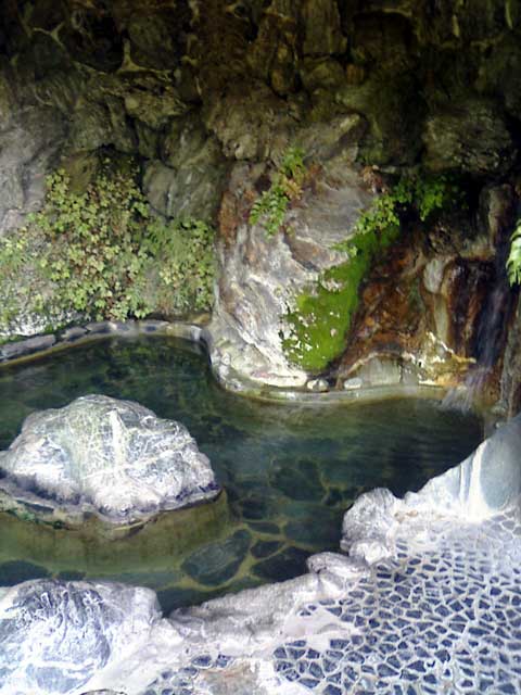 この温泉のある鬼石町は、三波石と呼ばれる銘石(庭園作りで使うみたい)が産出されるらしく、三波石峡という峡谷では、青白くおそらく石英がまざったような独特な石がごろごろと転がっている(右の写真)。