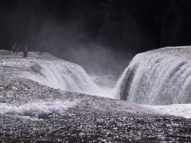 吹割の滝は、沼田から尾瀬に向かう途中、老神温泉の近くにある東洋のナイアガラと呼ばれる滝らしく、その名の通り巨大な岩を吹き割ったような形状が滝になっていて、しかもそれをそのすぐそばで見ることができる、迫力満点! 滝そのものも迫力満点なのですが、すごーく細い遊歩道には一切柵がなく、すぐ隣は川。にも関わらず結構な数の観光客がいるので、すれ違うときに川に落っこちそうになる…これの方が迫力あったかも。