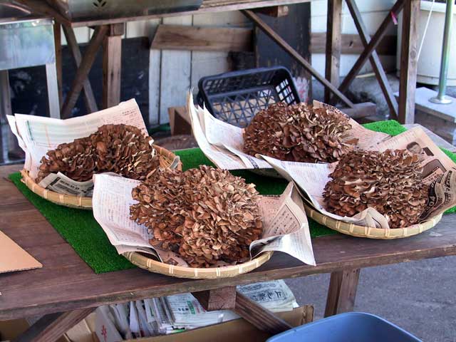 この一帯の渓流もなかなか綺麗で、新緑と水と岸壁のコントラストが美しいです。無料駐車場と謳う駐車場にとめると、おばちゃんが現れて「とりあえず1000円いただいているんです、これ券はうちで買い物するときに1000円引きますから」と。うーん確かに駐車料金はタダかもしれないが、商魂たくましいなぁ…。で、そんなお店で売っているのは、バカでかい舞茸をはじめ地元で採れたものとか(これを買ってもなぁ)、どーでもいいお土産品とか…