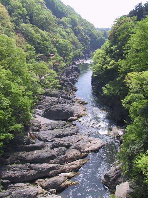 鍾乳洞のある大間々という町には、高津戸峡という渓谷があって、はねたき橋から高津戸橋まで遊歩道が整備されていました。はねたき橋からの眺めは(高所恐怖症だと間違いなく歩けなくなりそう…)、左の2枚の写真の通りすばらしく美しく、遊歩道を歩くとゴリラ岩と言われる岩(右の写真の中央)などを眺めながら渓谷美を楽しむことができます。