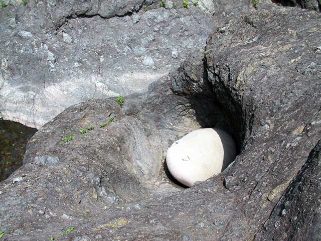 真ん中の白い岩(かなり大きい)が入った窪みは、かつて硬い岩(白い岩)が柔らかい岩盤を渦の流れに沿って削った跡だそうで、なんとなく口の中に入れた玉子とか大福みたいで変な感じ。