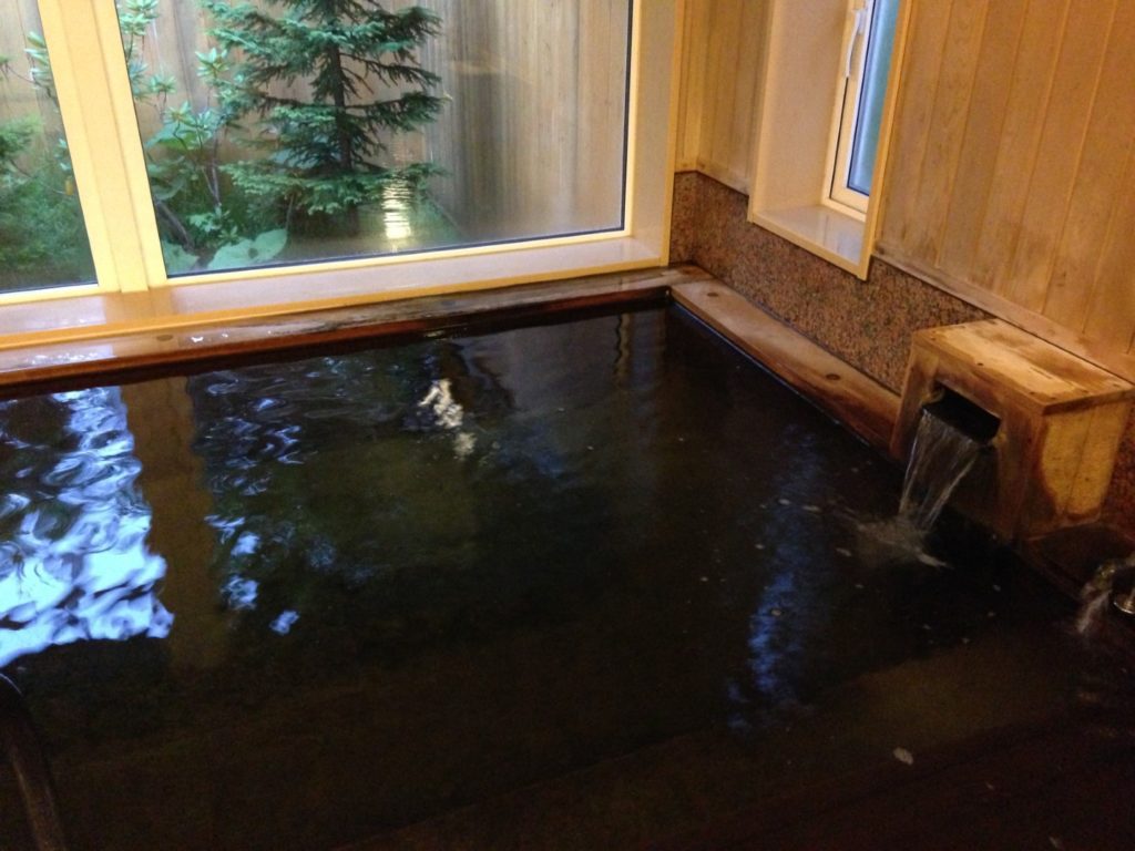 温泉はちょっと緑色で少しぬるぬるした感じのお湯、浜頓別の温泉もそうだったが、なんか昆布とかを煮付けたんじゃないかって思ってしまう色と湯ざわり。このぬめりのせいか、お湯が注がれるところが泡だらけになっている。ちょっと古めの木の浴槽がなかなかいい味を出している。