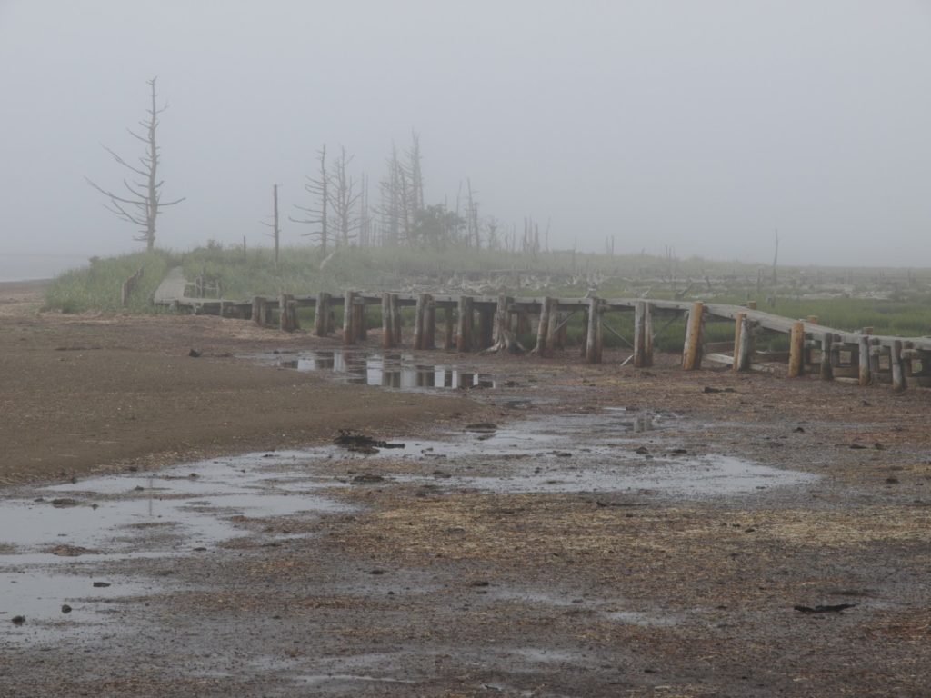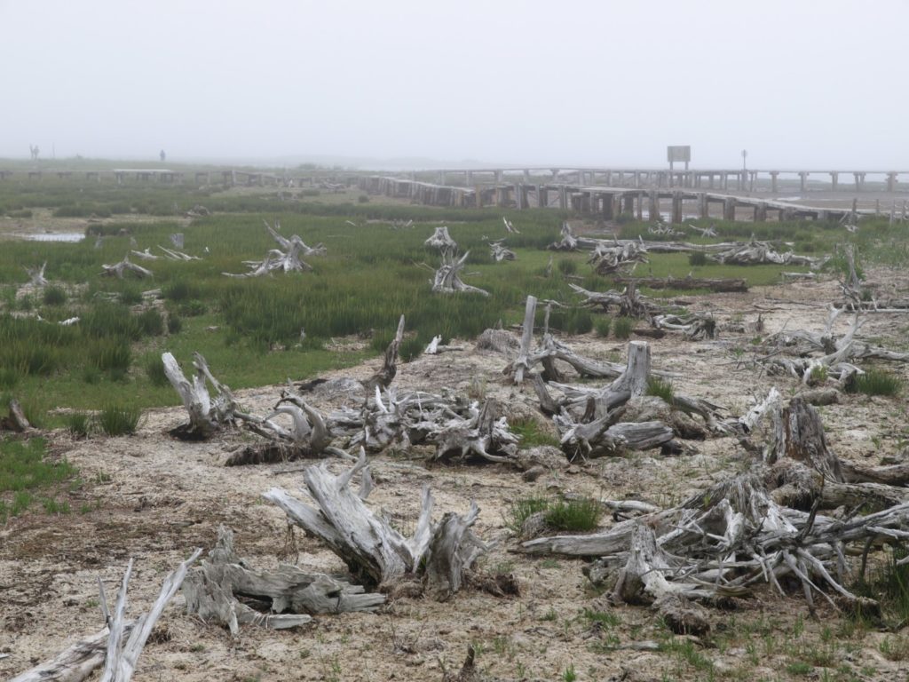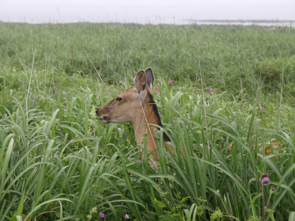 野付半島のトドワラは、立ち枯れた木が立ち並ぶ荒涼とした風景が特徴。だいぶ前に来た際には、その数がもっとあったような気がするのですが、今回の訪問時にはかなりそれが減って枯れた切り株というか根元だけが残っている状態になっていました。この雰囲気だと、もうあと10年もしないうちにこの独特な景観が失われるかもしれないなと思います。一方で、このトドワラに至る途中の小路は緑や花に覆われていて、時々野生の鹿が現れるので子供連れだと鹿を探しながら歩くのも面白いかもしれません。いきなり目の前に現れてびっくりなんてことも。
