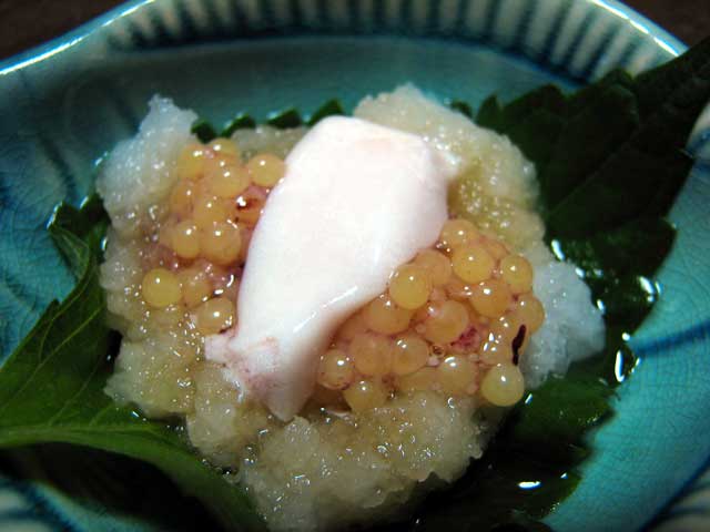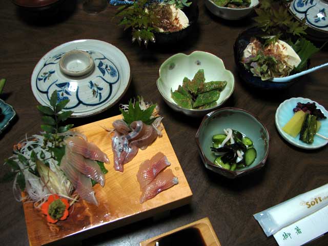 楽しみにしていたお料理には本当に満足。岩魚や山女のお刺身にはじまり、山で取れた茗荷や山椒などをうまく使った料理の数々、山菜の天ぷら、胡桃味噌と思われる甘いお味噌でいただく茄子も美味。これらを平らげた後に出てきたのが、お刺身に使った岩魚や山女の骨と皮をカリカリにあげたものと、なんと、岩魚の卵と白子。辛味の強い大根おろしと一緒にいただく。初めていただく珍味。