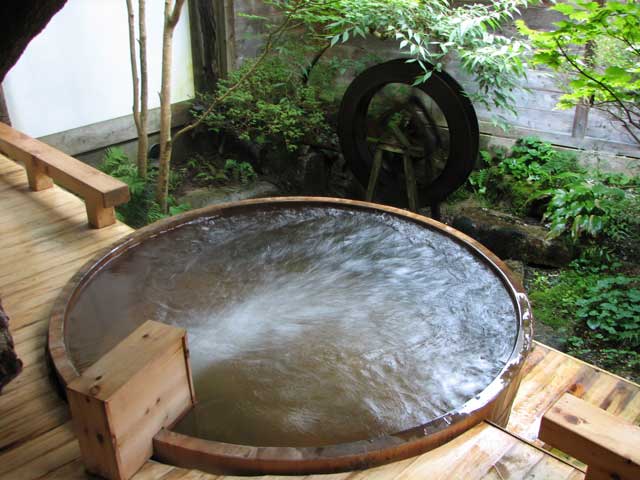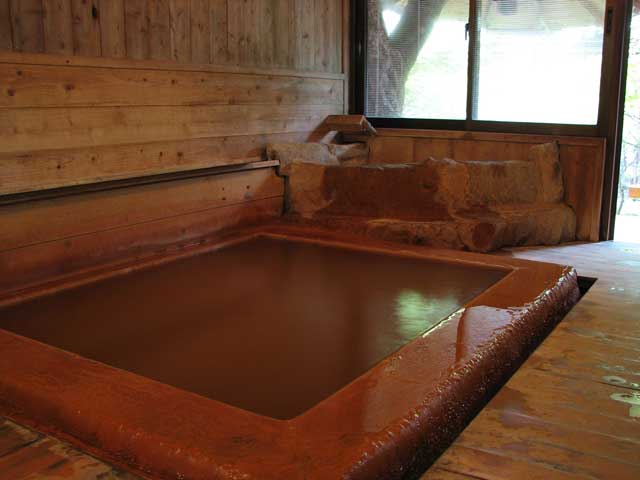 大量のカルシウムなどを含む鉱泉(湧出温度が 8度程度)で、その濃厚な成分が析出して風呂桶に不思議な模様を作り出しているのが印象的。鉄分のようなにおいが感じられて、湯ざわりは少しきしきしした感じがある。自分が入ったときは、少しぬるめになっていてじっくり入って体に成分がしみこんでいく。温泉ではないけれど、外の露天は雰囲気があっていい感じ。