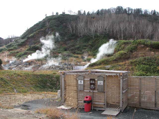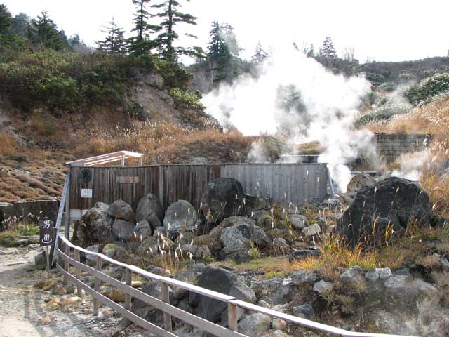 後生掛から八幡平に至る途中に蒸ノ湯という鄙びた温泉宿がある。山頂の散歩で思ったよりも体が冷えたので、ここのお湯を頂いてみることにした(笑)。受付でお金を払うと、露天風呂がちょっと歩いた先にあるというので、さっそく向かってみる。男湯と女湯それから混浴の露天があり、まず男湯に行ってみた。まず何よりその開放的な雰囲気に驚く、周りに何もない。もうもうと蒸気を噴き出す脇で、しかもそこからダイレクトにお湯が流れてきているようだ。早速と思い入ってみると、とにかく熱い。ちょっと入るには度胸がいるくらい熱い。後から来た人は入れなかったようだが、体が痺れるほどの熱さだ。