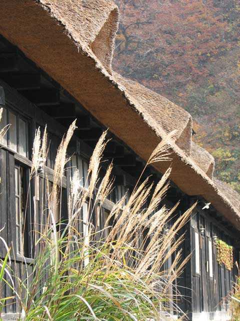 鶴の湯温泉の茅葺きの屋根と真っ黒な板張りの本陣は、鄙びた風情があっていつ来ても素晴らしいと思う。紅葉の時期を少し過ぎた感じでススキの穂が揺れる向こうに本陣を見える雰囲気もまた良い。