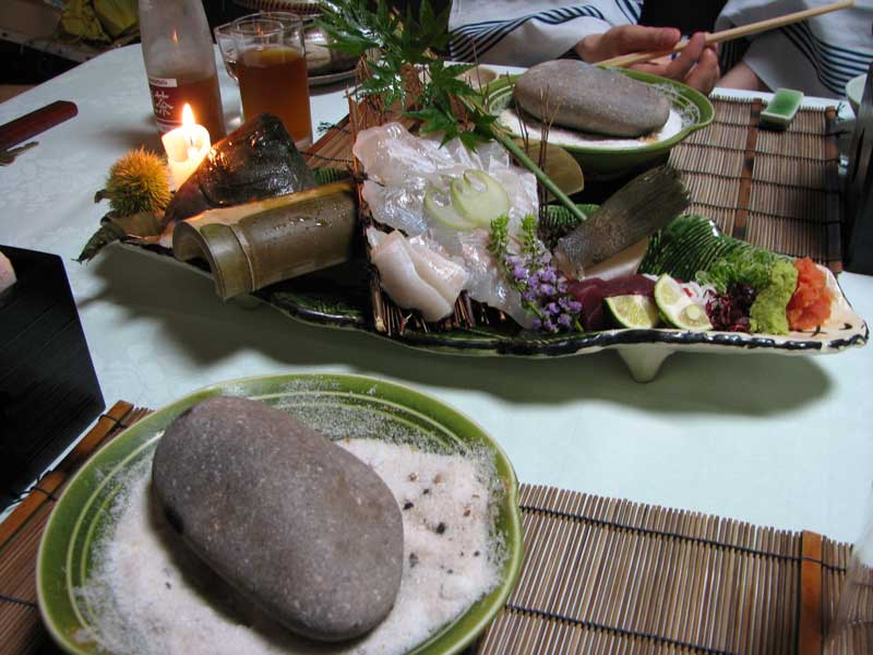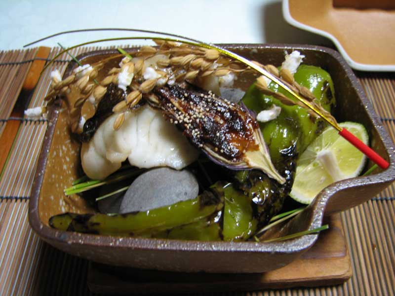 旅館大橋の楽しみは食事にも。ここの料理長さんは、「現代の名工」や「黄綬褒章」を受賞した方なのだそうで、下の肥えた(笑)女性に料理を楽しんでもらうための様々な工夫を凝らした料理が楽しめる。その一つが、ヒラメの石焼。意図的に厚めに切られたヒラメの身を熱した石の上で炙ることで香ばしさと食感をプラスして楽しむ料理、コレはなかなか美味しい。次々と供される料理は、量は控えめではあるけれど一品一品凝っていて、なるほど女性向けという感じがする。僕はどちらかというとこの手の料理は結構好き。