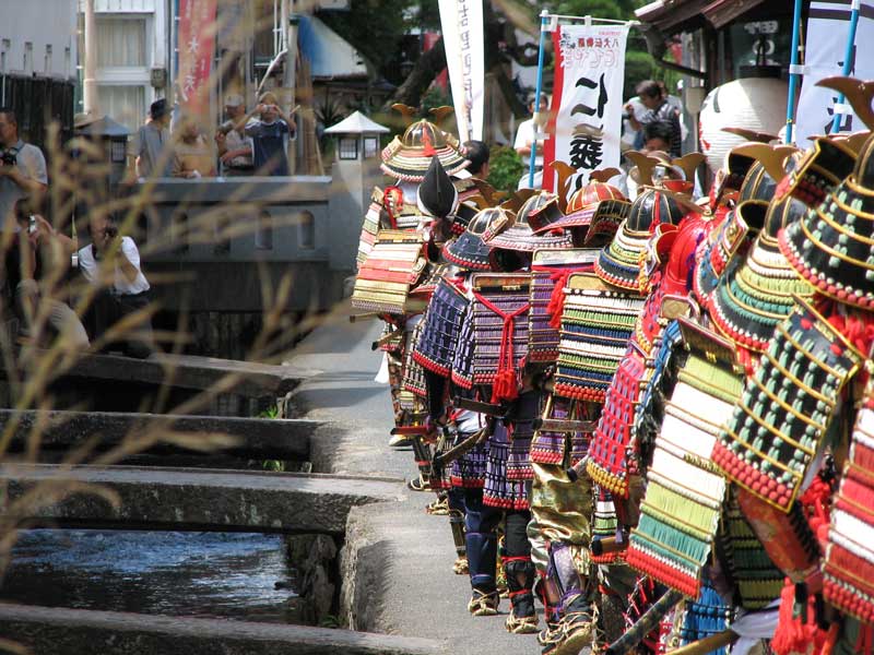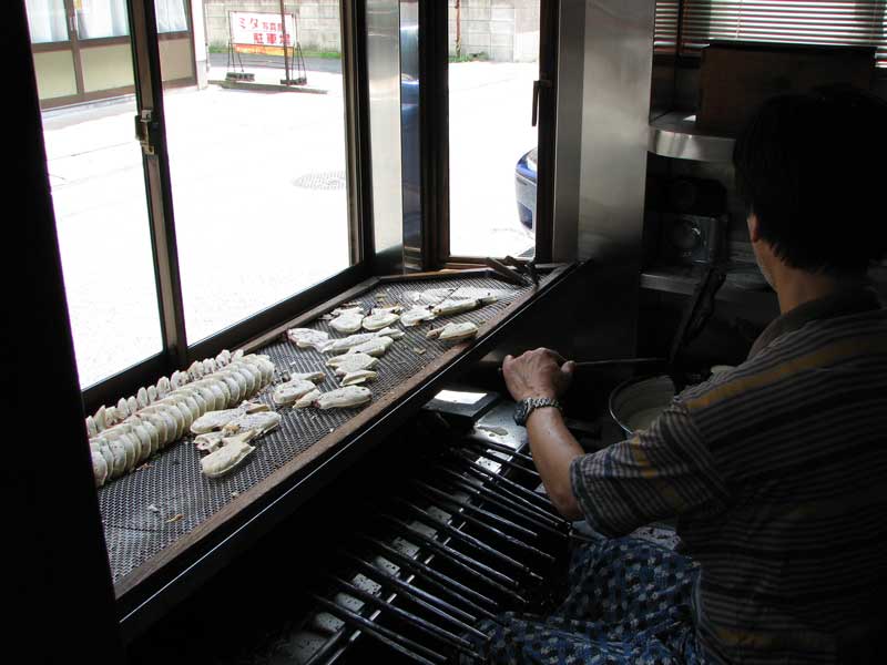 この街では、いたるところで木彫りの福の神とあうことが出来る。さすると食べるのに困らないという大黒様や、立派な大きなおなかの布袋様などなど。その他にも写真のような旅人を守るという神様のオブジェとか。結構いろいろと隠れている。その隣は、白い生地に包まれたたいやき。通常のものより薄いのだけれど、甘くて懐かしい味。この日は、偶然「里見氏」のお祭り。実は、この打吹地区にある「大岳院」というお寺に、千葉は南総安房里見の八賢士が祀られていることにちなんだもの。あの映画「南総里見八犬伝」のテーマ曲が流れながらのお祭りだったので、なんかとても妙な感じがしたけど(笑)。