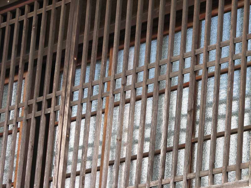 2枚目の写真は、旅館大橋の太鼓橋。この橋、実は外から見るとアーチ状をしているけれど、実は内部の廊下は平坦という面白い構造をしている。3枚目の写真は三徳川の対岸から旅館大橋を望むもの。夕暮れ時だったのだけれど、流れの美しい三徳川に歴史を感じさせる木造建築が映りこむ様子がとても美しい。どの部屋からも、この三徳川の流れを見ることができる。また、厚みにむらのあるガラスがいい雰囲気を出している。この旅館の面白いところは、一つとして同じしつらえの部屋がないこと。また、今では入手困難な様々な銘木を使っているのだそう。