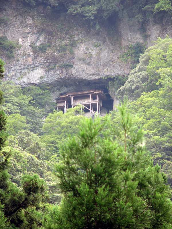 三朝温泉からバスで20分程度の場所に、切り立った崖に建てられたお寺があるという。このお寺、写真とかで時々目にすることがあった気がして以前ちょっと見てみたいなぁと思っていた。投入堂という名のそれは、実は国宝に指定されていて、今年はこのお寺の開山 1300年ということらしく、「日本一危険な国宝見学」みたいなフレーズで地元はほんの少し盛り上がっているみたい。最初にタクシーの運転手さんが、双眼鏡で投入堂を眺められるという場所に連れて行ってくれた。下から見ると小さく見えるそれは、確かにとんでもない場所に作られている。近くで眺めてみたいが、結構険しい道だというので奥さんを置いて参拝することに。