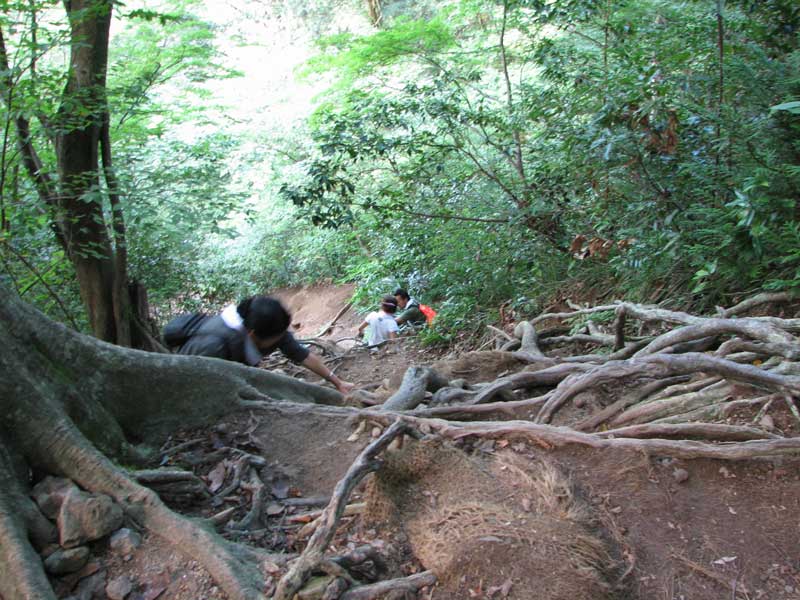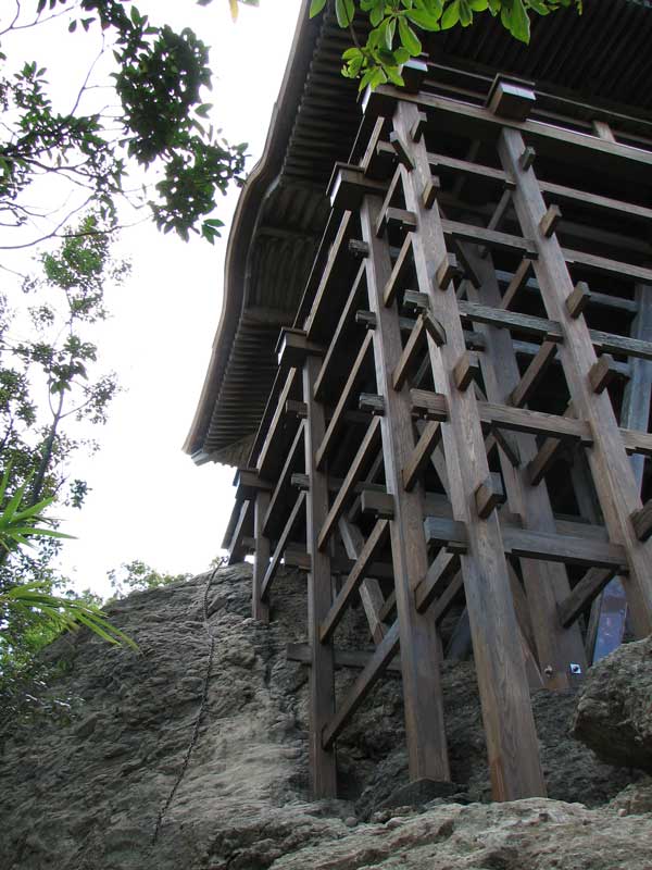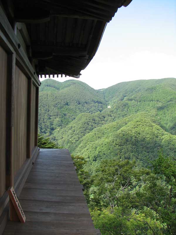 そこから少し進むと、いわゆる「登山道」は姿を消して、目の前には木の根がくねくねした場所に出くわして、何人かが立ち往生している(笑)。これ、這い上がれってコトなんですかねなどと会話を交わしつつ登っていく。そんな難関の続く「かずら坂」を登るとようやく建物が見えてくる。大きな岩の上に建てられていて、その横には申し訳なさそうに鎖がたらり。コレを登ってようやく「文殊堂」に到着。「文殊堂」やこの先の「地蔵堂」の外回廊には柵がないので高所恐怖症の人だと歩くこともままならないかもしれないが、ココからの眺めは最高に気持ちがいい。