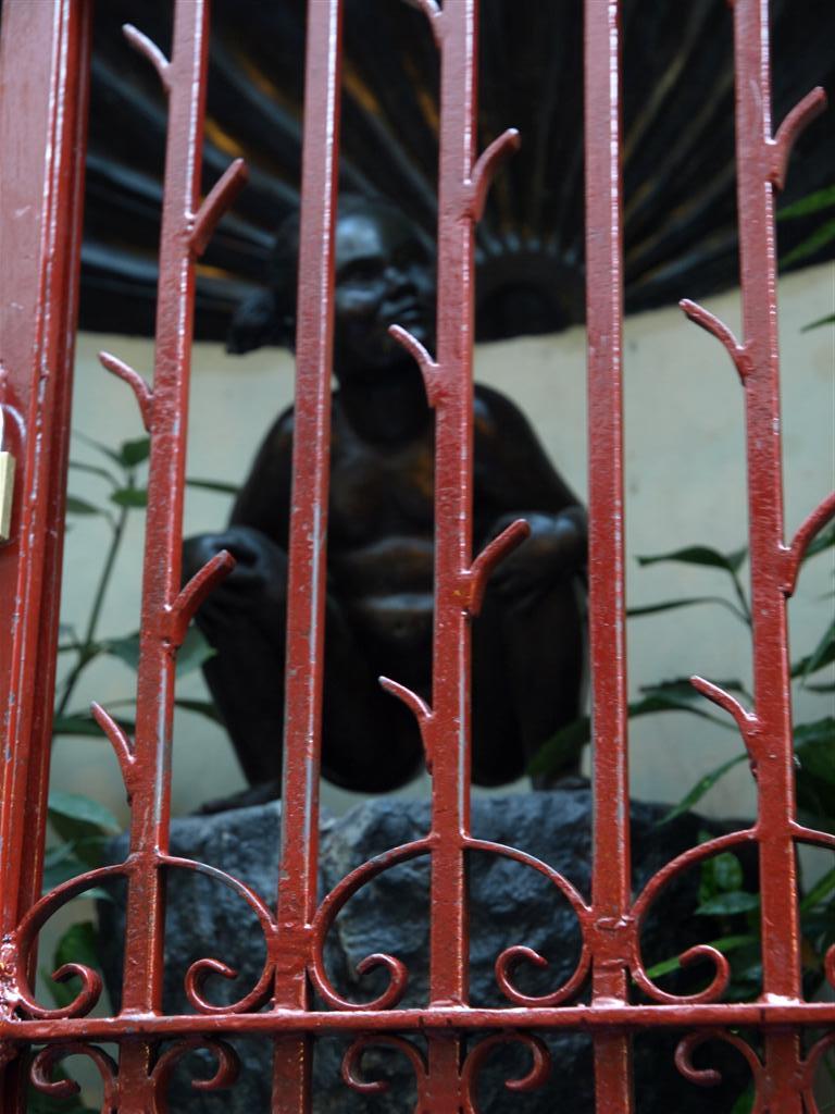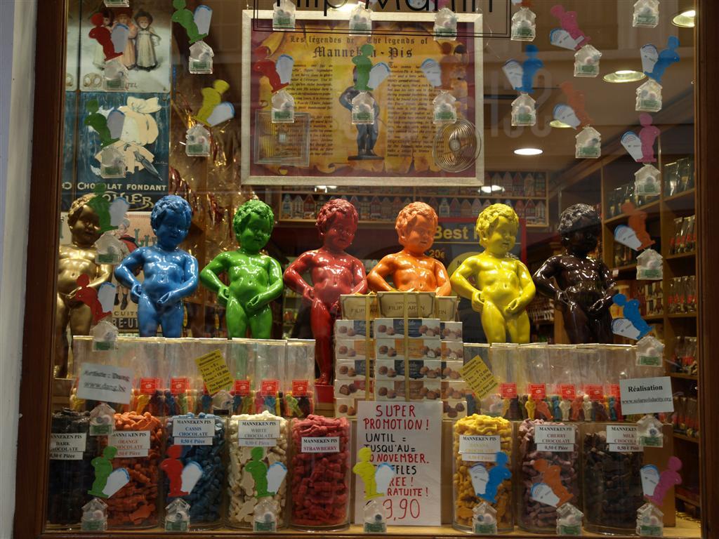グラン・プラスから少し歩いたところに、かの有名な「小便小僧」がいます。別名 Petit Julien といわれるだけあって、確かに小さい(笑)。この Julien クンには数多くの衣装が世界中から送られてくるのだそうで、この日は黒いロングコートを着ていました。