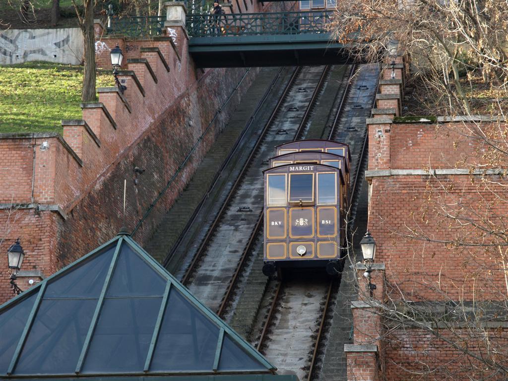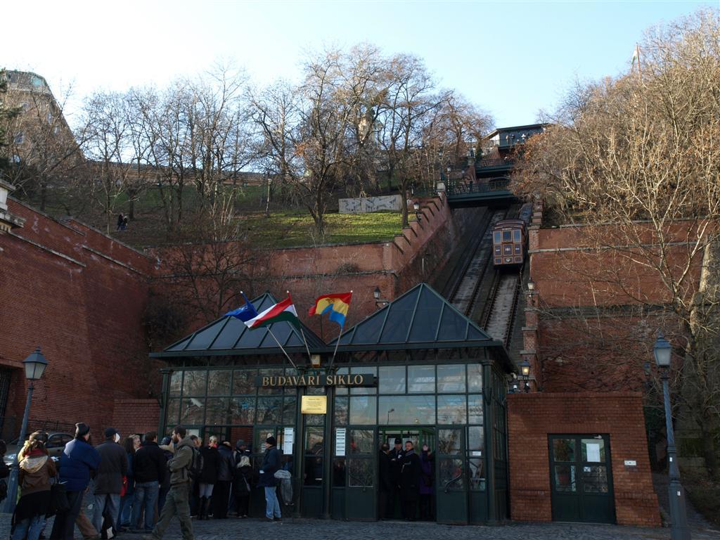 くさり橋のたもとから王宮へは可愛らしいケーブルカーがあって、これを使うかバスを使っての上り下りが楽チン。でも眺めを楽しみながらのんびりと降りてくるのも一興です。実際、自分たちはベビーカーに苦労はしながらものんびりと歩いて降りてみました。そうすると、くさり橋とその向こうの聖イシュトヴァーン大聖堂が綺麗に見渡せていい感じなのです。