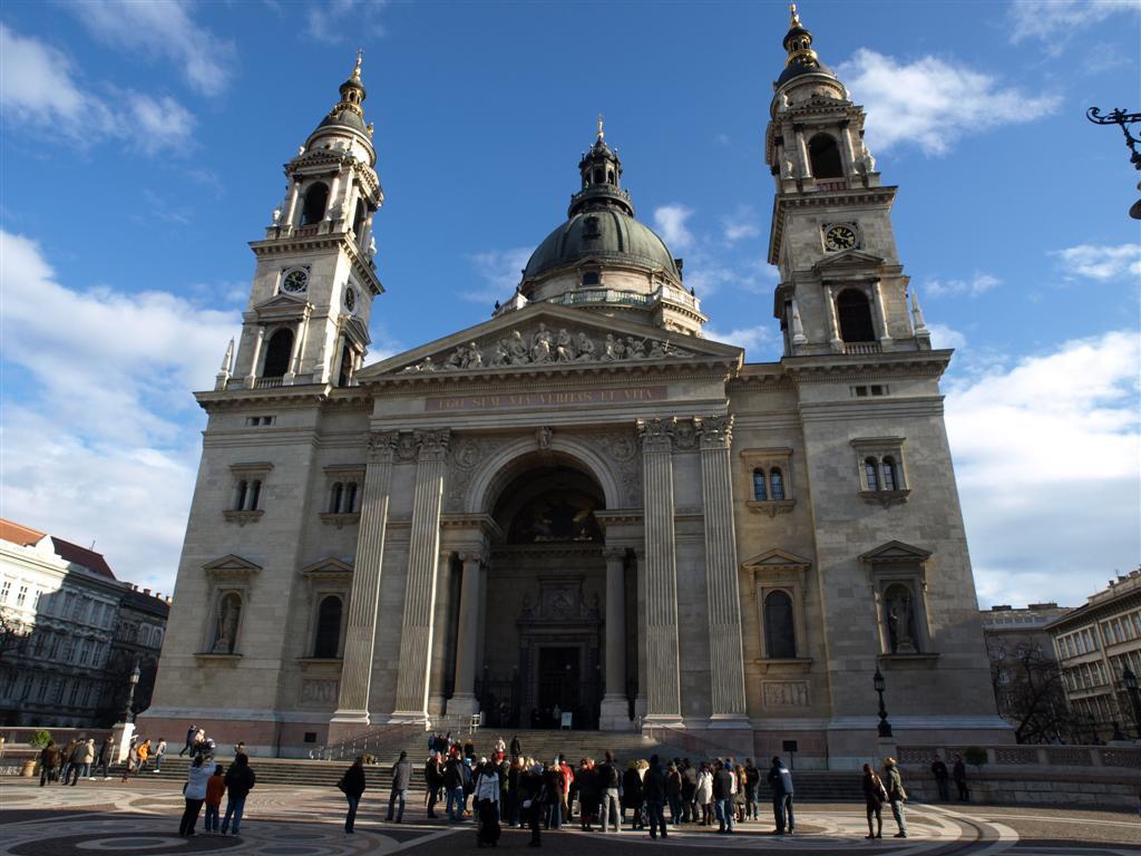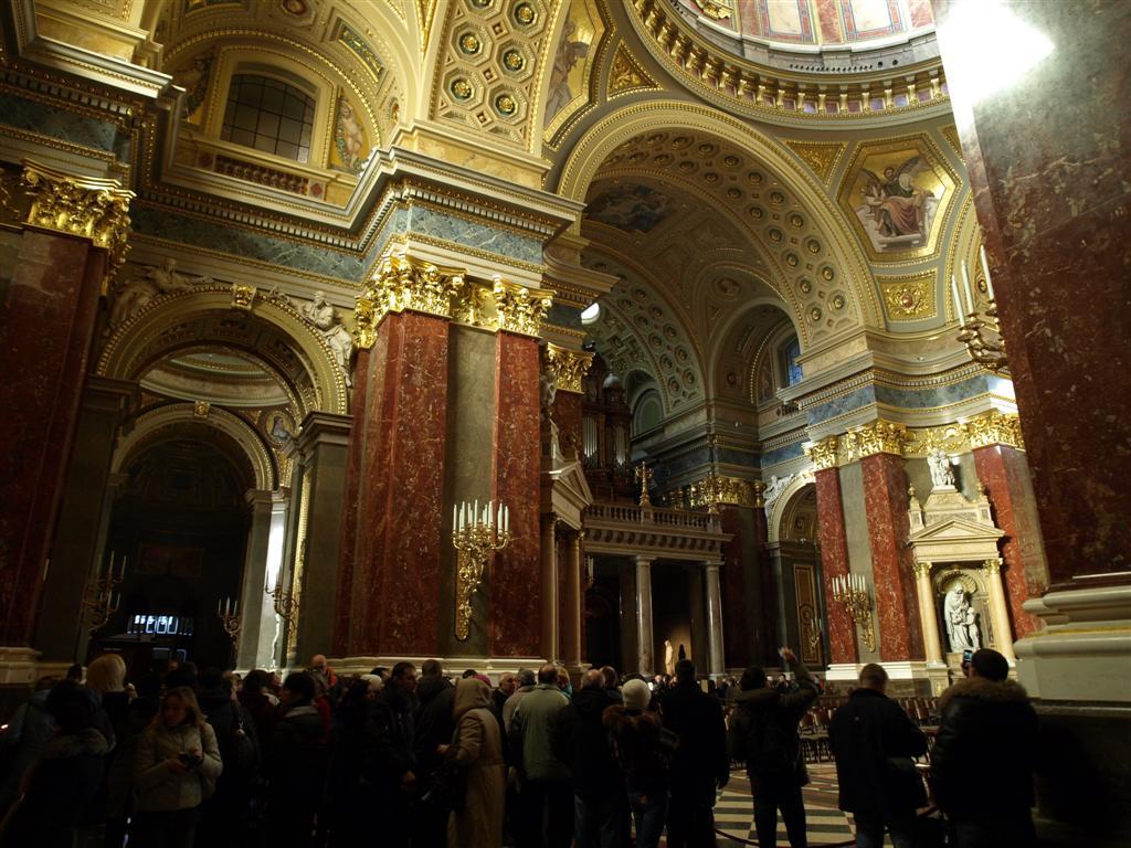 山がちなブダ側に比べると、ペスト側は平坦で多くのホテルやショッピングモールなどがあります。最初に向かったのは、王宮からもはっきりとその姿を見ることができる聖イシュトヴァーン教会。この教会、目の前にするとその大きさに圧倒されます。それもそのはず、中央の巨大なドームは高さが 100メートル近く、直径も 20メートル強もあったりします。内部は絢爛豪華、でもそれが逆に個人的にはあんまり好みでは無いなぁという雰囲気。初代ハンガリー国王だったイシュトヴァーンは積極的にキリスト教を受け入れ、その右手は聖遺物として小さな礼拝堂に祭られていました。