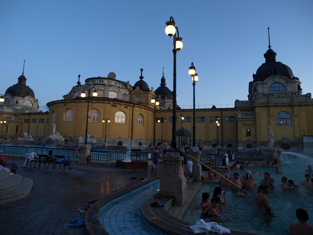 新婚旅行の時はツアーだったので行くことができなかったのが温泉。ブダペストには 50近くの浴場があるのだそうで、温泉好きな自分なので今回はぜひということで、その一つセーチェニに行ってみました。というのも、ココの名物「風呂チェス」に興味があったからです。地下鉄で行けてしまう気軽さが羨ましいなぁなんて思いつつ着いたセーチェニ温泉駅を出ると、すぐ目の前に建つ黄色の建物がどうもそれらしい。1913年に造られたというだけあって、なかなか歴史を感じさせる受付です。最初に 1500円ほどの料金を払うと、ロッカーの鍵にもなるカードキーを渡されます。中に入るときに時間が記録されて、出るときの時間によっていくらか返金されるというシステムのようでした。