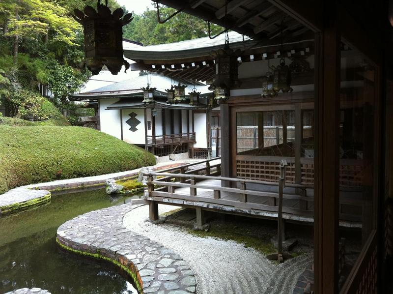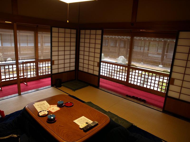 見事な庭園を望むことができるお部屋で、まだまだ朝晩の冷え込みが寒いためかこたつがおいてありました。高野山には一般の宿泊施設がないため、こうしたお寺さんがやっている宿坊が結構な数あるようで、お寺の中におみやげを扱う小さな売店があったり、しっかりとした温泉施設が作ってあったりとわりと快適に過ごせるようになっているようでした。寒いくらいな日だったので温泉はありがたく、また子どもがいるので畳敷きの温泉はすごく助かりました。