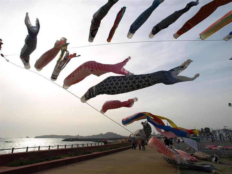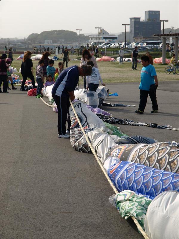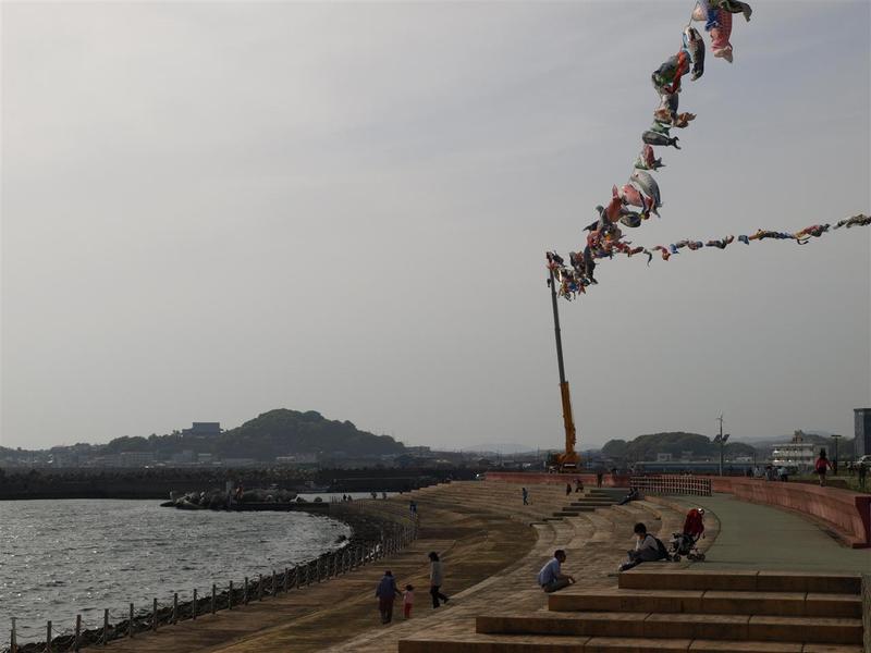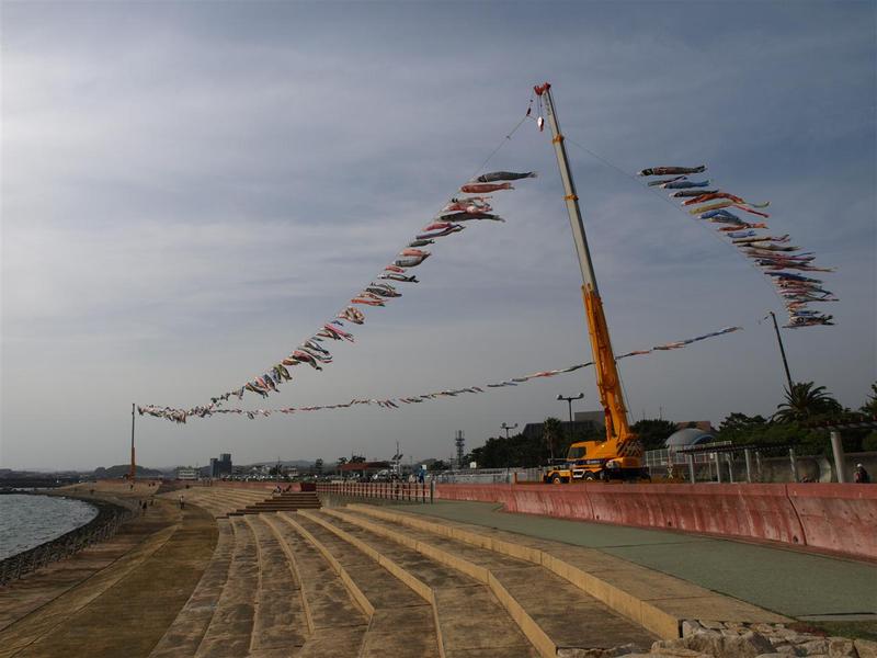 場所は田辺の扇ケ浜。3台のクレーン車が目に入らなければもっと風情のある感じなのかも知れないけど、それでもなかなかのいい景色。海辺を散歩したり楽しんでいたら、クレーンが首をもたげ始めたので、どうやら片付けるらしい。うちの子供も、近くまでおりてきて目の前で風に大きく揺らぐ鯉のぼりにちょっと興奮気味。