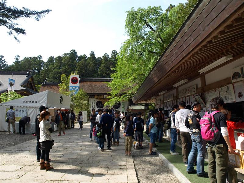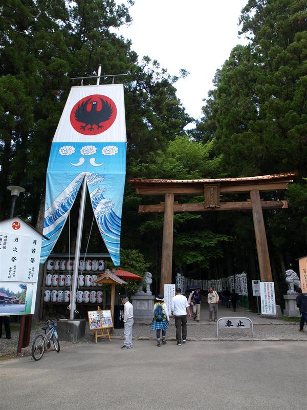 昔の人はおそらく何日もかけて中辺路を歩いて目指した熊野本宮、この日は子供の日が近かったこともあり八咫烏をあしらった鯉のぼりらしきものが出迎えてくれました。そう、自分も全く知らなかったのですが八咫烏って熊野の神々の使いだったのですね。初夏の緑が気持ちの良い中を登って行くと檜皮葺の屋根が非常に美しい熊野本宮の社殿を見ることができます。本宮の入り口には、しめ縄で作られた八咫烏の飾りがあったのが印象的でした。