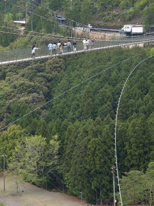 谷瀬の吊り橋は、おそらくこの村を有名にしている観光名所の一つ。もともとこの吊橋を訪ねようとしていたわけでは無いのですが、道中ずーっと現れる看板が気になって見に行ってみたという感じだったのですが、来てみて正解。川面からの高さは50メートル以上その長さ約300メートルの吊り橋で、深い山にすーっとひかれたその美しい姿とは裏腹にかなり揺れるので高所恐怖症の人にはかなり厳しい感じの吊り橋です。自分はそうではないのですが、踏み板が結構しなるので、そのまま足が抜けちゃうのではという怖さと、橋の真ん中付近は両サイドの網が自分の身体よりも低い場所に来ることもあって、スリル満点。
