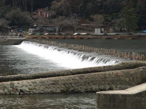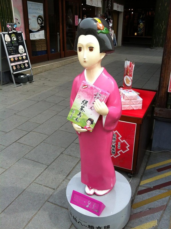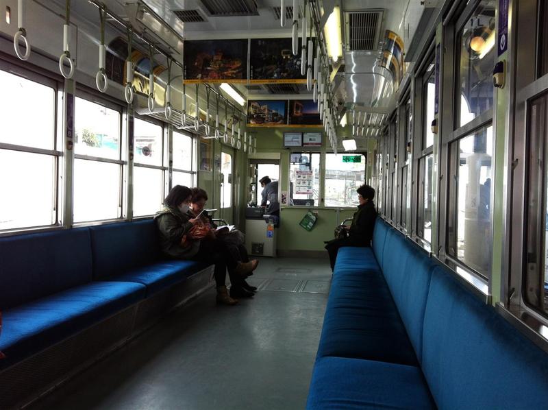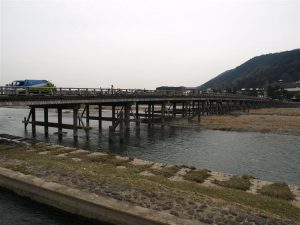 翌日は嵐電に乗ってノンビリとお散歩してみようということで、まず最初に向かったのが嵐山。ちょっと怖い八つ橋の「夕子」さんのいる目抜き通りを抜けて渡月橋まで。とはいえ、我々のような家族連れが楽しめる感じでも無いので、早々に嵐電に乗って次の目的地に向かうことにしました。嵐電のこのなが〜い椅子って何かすごく懐かしい気がします。