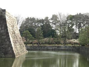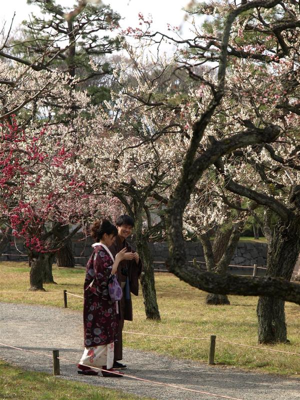 本丸御殿からから西の橋を渡ると向こう側に綺麗に梅が咲いている様子が見えました。桜は残念ながらまだまだ早く見られませんでしたが、梅が見事に満開でした。子供も気に入ったようでしきりに花を見ていました。この日は和服・着物を着ている人は入場無料というイベントか何かをやっていたせいかそういう格好をした人がちらほら、悪くないです。