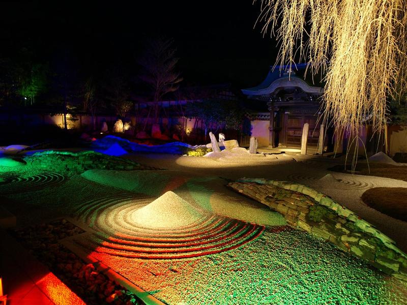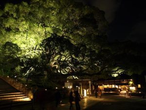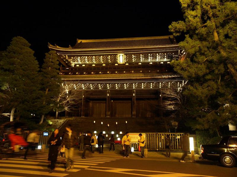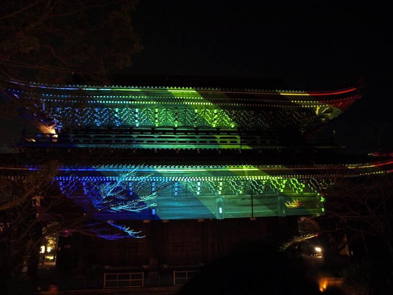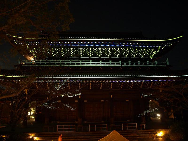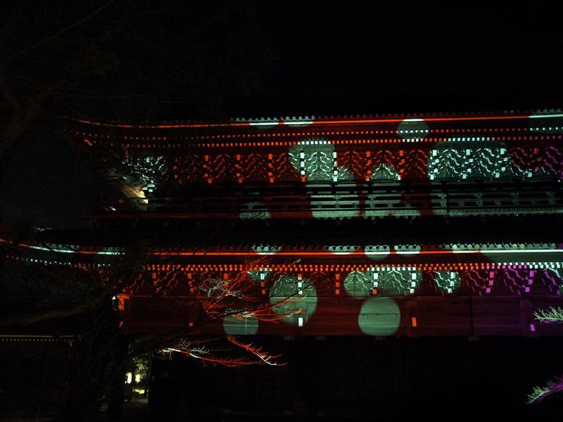花灯路の10周年記念事業の一つとしてやっていたのが、知恩院三門の「幻想の灯り」というイベント。この三門の形状にあわせてプログラミングした映像を投影しているようで、個々の部材の断面が異なる色に光っているように魅せる演出などがあったり、逆に水面の波紋のような映像を当てることで、そこに存在している三門がふわふわと動いているように見えるなど、非常に面白いものでした。10分強くらいだったと思うのですが時間を忘れて思わず引き込まれる演出でした。