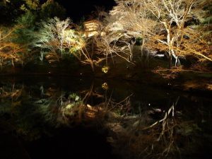 花灯路の期間中に特別拝観が可能になっていたのが北政所が開設した高台寺。ライトアップされた庭園、臥龍池に鏡のように映る木々、夜に訪ねるとまた違った雰囲気を見せる秀吉と北政所が祀られている霊屋などなど、ちょっと時間が無くて駆け足で見たのですが、それでもこういう雰囲気を楽しめたのは幸運でした。