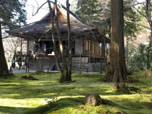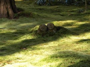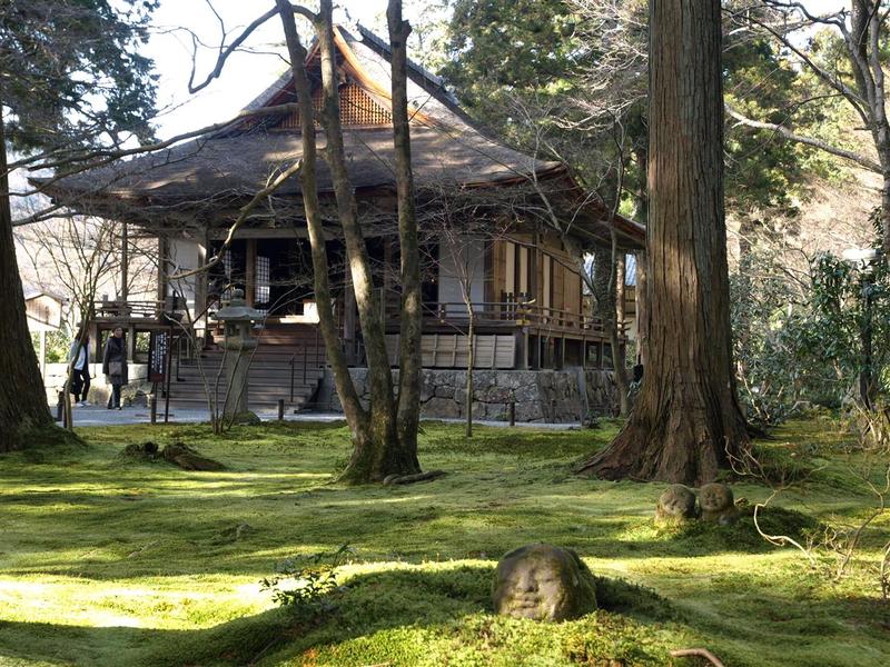 三千院でまず目を引いたのが元三大師の絵。元三大師と呼ばれる良源が鬼の姿になって疫病神を払ったというのが云われで、この良源がおみくじを作ったと言われているのだとか。ここでは写経をさせていただきました、久しぶりに筆ペンを持って書いたのでなかなかうまくいかないものです(苦笑)。国宝の阿弥陀三尊像が収められている往生極楽院のある庭園は苔むしていて中々いい雰囲気なのですが、そこにひょっこりと現れるのがこのわらべ地蔵たち。緑の絨毯の上で戯れる子供たちのようですごく可愛らしいです。