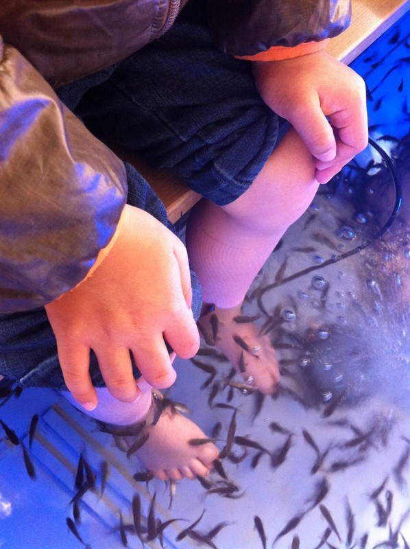阿蘇ファームランドには、温泉施設やちょっとしたふれあい動物園、さまざまに身体を動かしてチャレンジする元気の森などをはじめとする健康体感施設、地元の食材を使ったレストランやカフェ、ミルクファームや阿蘇ビールなどが買える買い物の施設など一日じゃとても遊びきれないくらいの施設があって予想以上に楽しめました。一度やってみたいなと思っていたドクターフィッシュは、家族みなで楽しむのにぴったり(笑)。