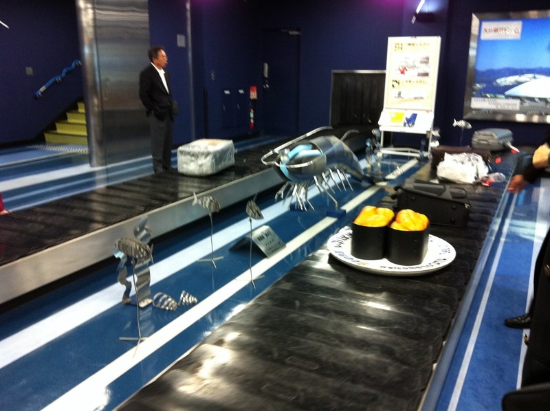 久しぶりの九州への旅行、今回は別府から阿蘇へと向かうことにしました。大人のわれわれには温泉やおいしい物が待っているし、子供には城島公園のような大きな遊園地や阿蘇ファームランドような場所での動物とのふれあいもありそうだしということで。大分空港の荷物受け取りカウンターが面白かったのでちょっとパチリ。