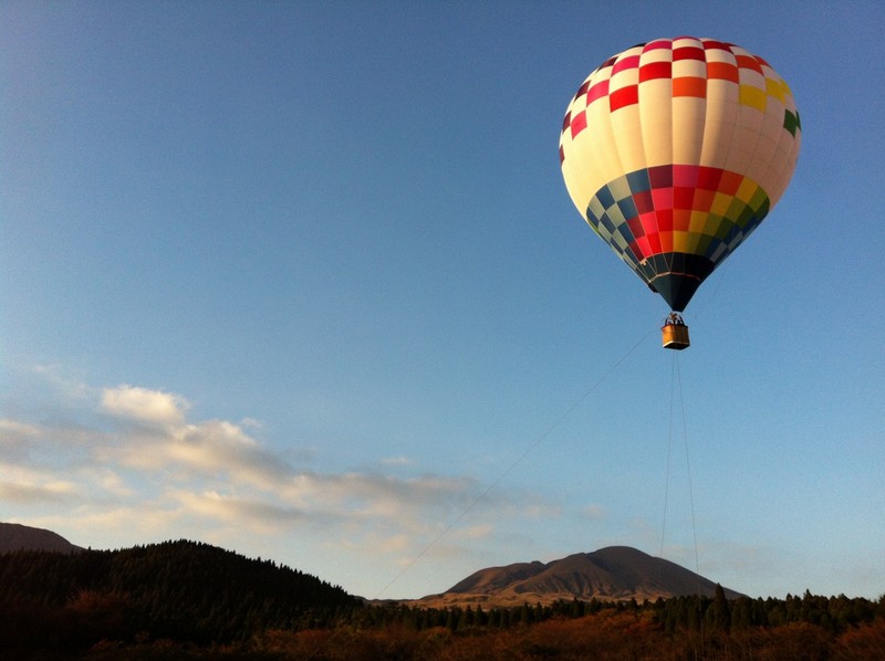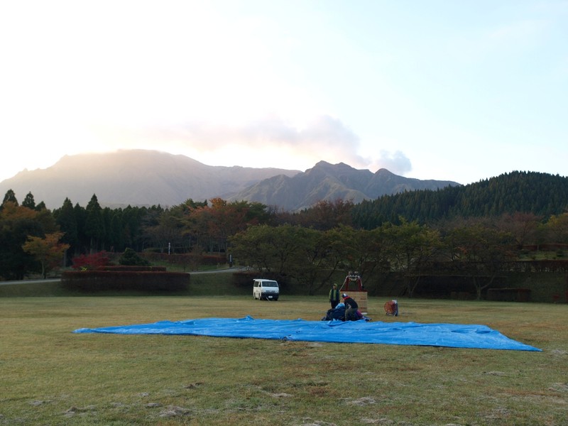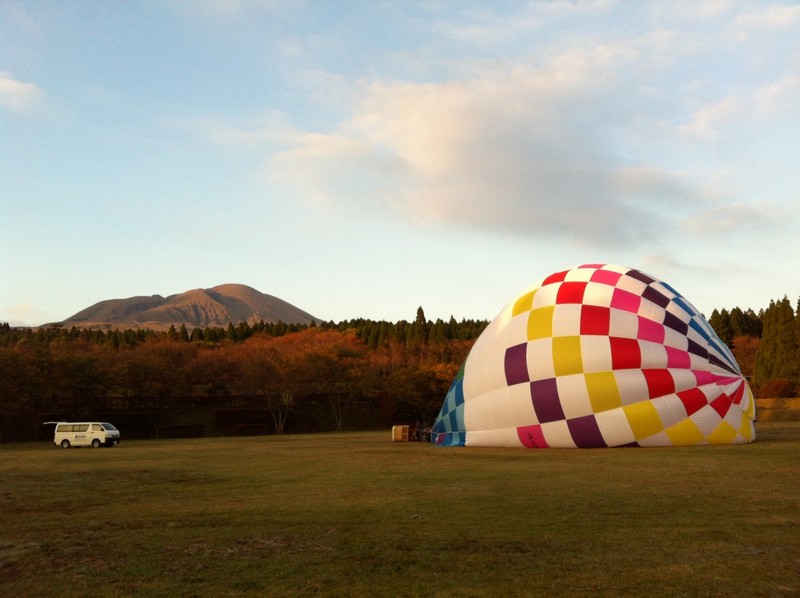 気球に乗るのはたぶん生まれて初めて。「ゴォー」という音とともに暖かい空気をたくさん入れた気球が持ち上がっていくさまを見ているだけで期待も一緒に膨らみます。思ったよりも全然狭い籠に乗せてもらっていざ出発。何度も飛行機に乗ったりしてるけど、ふわりと垂直に浮かんでいく感覚はすごく不思議。冷たく凛とした空気の中で気球に乗って噴煙をあげる阿蘇山や外輪の山々を眺めることが大満足。