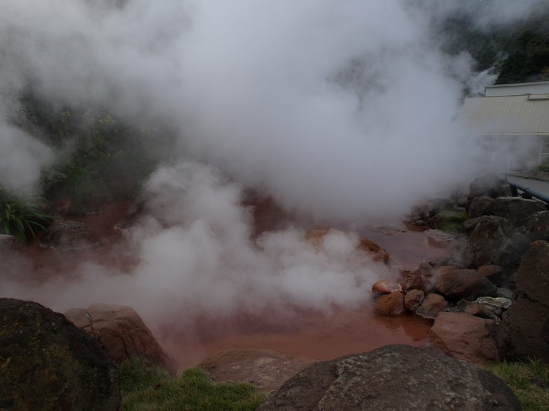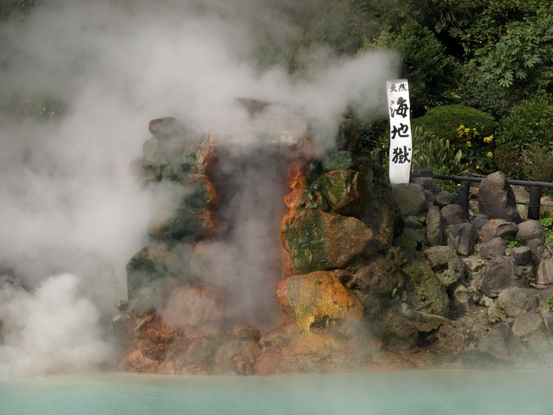 空港をおりてレンタカーを借りてのんびりとドライブしつつ向かったのは別府の地獄めぐり、まずは鮮やかなブルーで見た目のインパクトも大きい海地獄から。あちこちで湯気があがっていたり、ちょっと見たこともない色の液体がボコボコと音を立てながら沸き立つ様はやはり何度見ても不思議で面白いです。子供はそのボコボコ沸き立つ様子が楽しいようで、小さな石を投げ入れて遊んだりしていました。