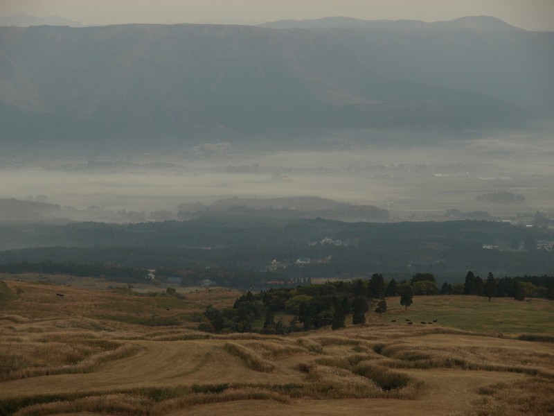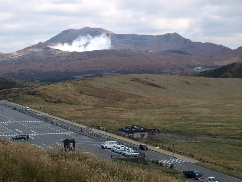長者原から阿蘇に至るやななみハイウェイの景色はすばらしいのひとこと。この時期はススキと枯れ草で太陽が当たると一面黄金色のようになります。阿蘇の外輪山からの眺め、米塚と呼ばれる不思議な山、草千里などを通り過ぎて阿蘇山に上ってみることにしました。気管支があまり強くないので、「気管支喘息の方は危険!」みたいな警告文があちこちに表示されたロープウェイに乗るのはちょっとドキドキしましたが、まぁ特に問題はなく。火口に溜まる水が毒々しいほどのヒスイ色をしているのが妙に目に焼きつきました。奥さんはこういうの苦手なので、防空壕みたいなところでしばらく待機してもらっていました(笑)。