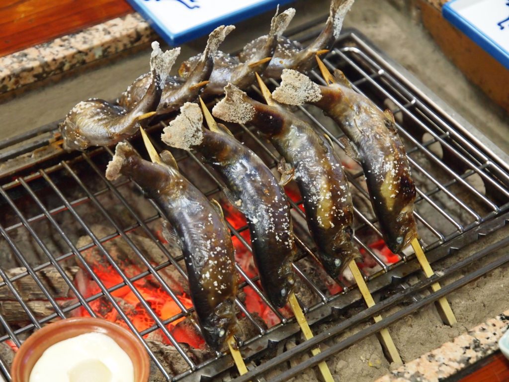 鮎の塩焼きや地元の堅豆腐や厚揚げにお麩を焼いていただく炉端焼きが定番で、ボリュームたっぷりですごく美味しいです。