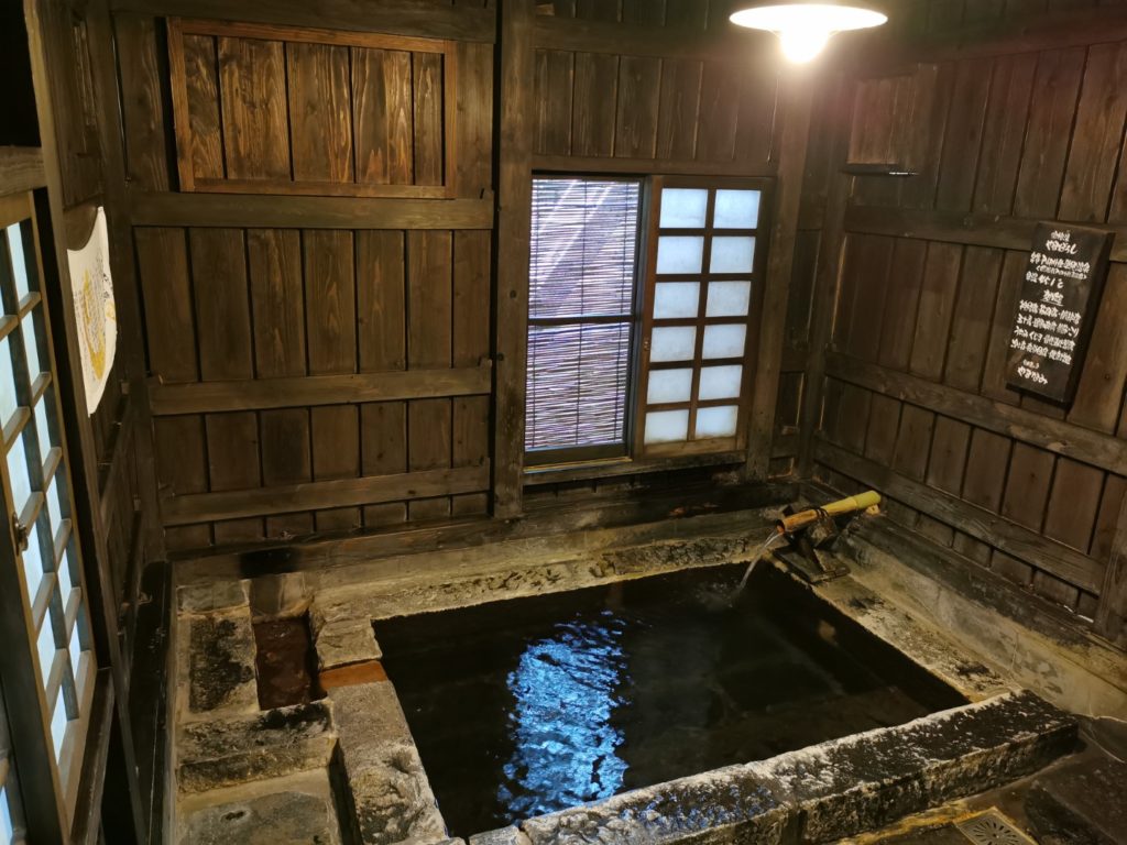 入り口から落ち着いた雰囲気で、日本秘湯を守る会の提灯がどんなお風呂があるのかと気分を盛り上げてくれます。玄関前に源泉が流されていて、温かいお湯で手を洗うことができます。どうやらちょうど良い湯加減のお湯が湧いている様子。