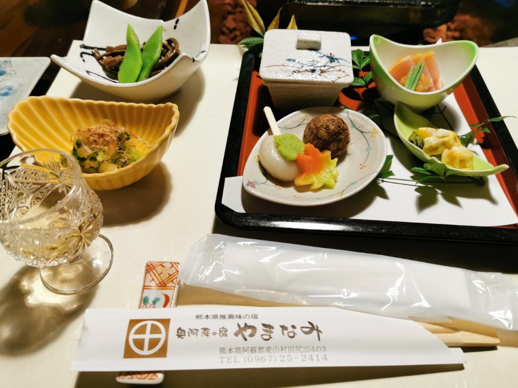 やまなみの夕食で目を引くのは、すごい種類のお漬物。20種類以上のお漬物がカラフルに並べられている様って、なんか見ているだけで楽しくなる感じ。そういえば、お昼にあか牛のステーキ丼を食べたときにも、同じようにたくさんのお漬物が出ていたので、この地域のおもてなしの典型なのかもしれません。