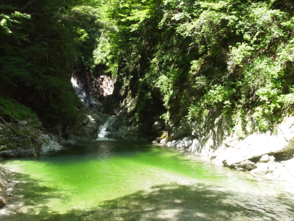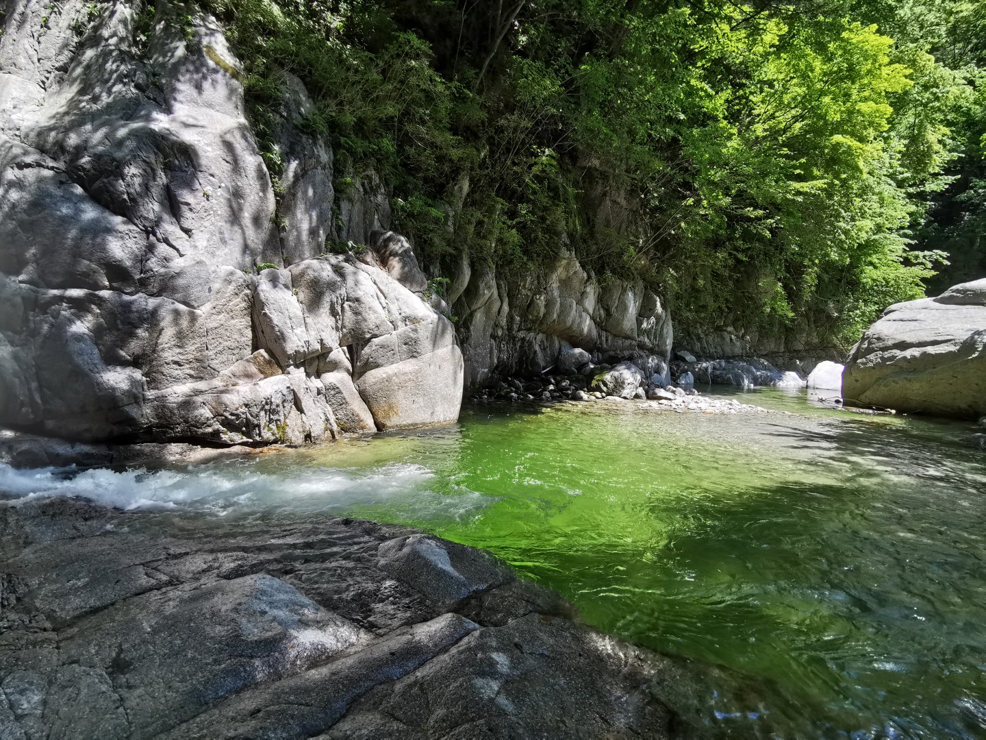 多くの滝を見ることができる尾白川渓谷で、最奥にある不動滝への道は通行止めになっていたので、今回は龍神平から神蛇滝を眺めてから帰路に。流れる水は透明なんだけど、流れが緩やかな場所ではエメラルドグリーンに輝くのがちょっと不思議な渓谷でした。ここは、秋の紅葉の時期にまた訪ねてみたいです。