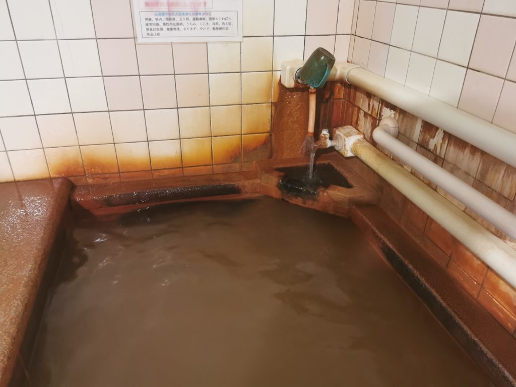 お風呂場に入ってまず気になるのは八角柱の洗い場。八角柱のそれぞれの面に蛇口が付いてるんだけど、普通に壁際にはシャワー付きの洗い場があって、今日は誰もそこを使ってなかった。お風呂は広々としていて、茶褐色の湯が注がれる狭い浴槽の隣にジェットバス、さらに普通の内湯が2つ、水風呂とサウナがある。この茶褐色の湯が注がれているのが炭酸冷鉱泉の湯。写真のホースで注がれているのが炭酸冷鉱泉で、その下からは熱めのお湯が足されている。どうやら、炭酸が抜けないように炭酸冷鉱泉を直接温めたりせず、熱い湯と混合してるとのこと。