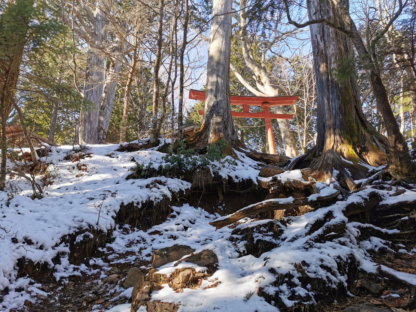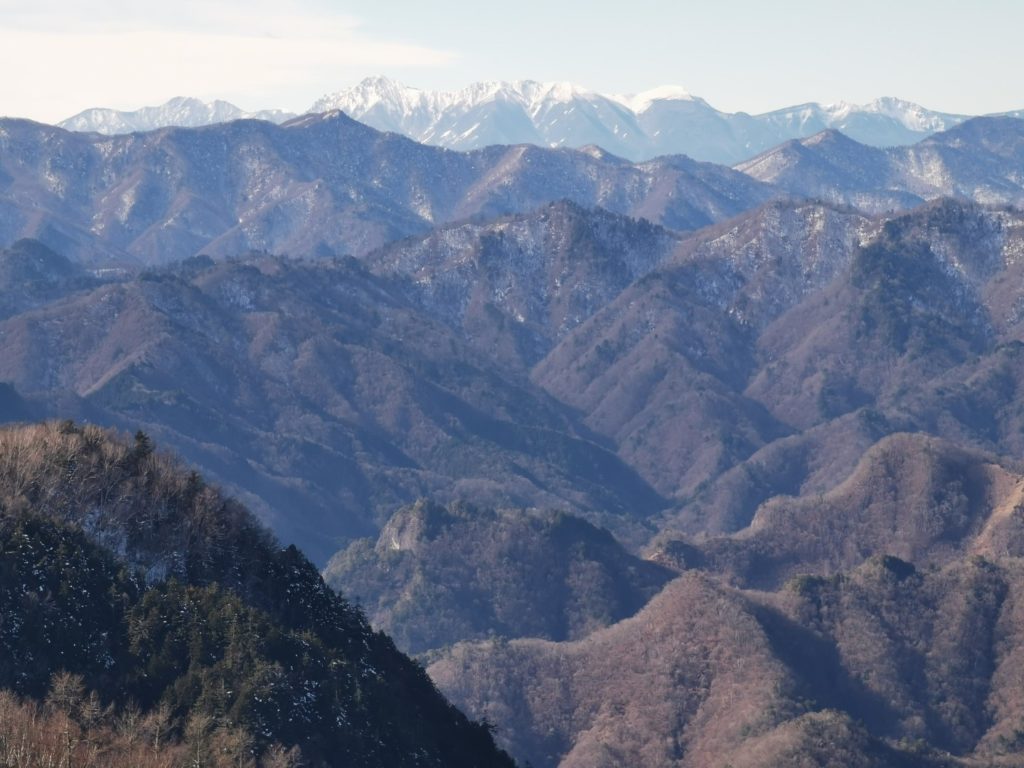 一筋縄では行かない登山で登りきったという達成感もひとしおだった両神山山頂とその周辺では、冬の澄み切った空気のおかげでくっきりと影ができ深いシワのように見える山の稜線が美しく、また遠くに富士山を見ることもできました。