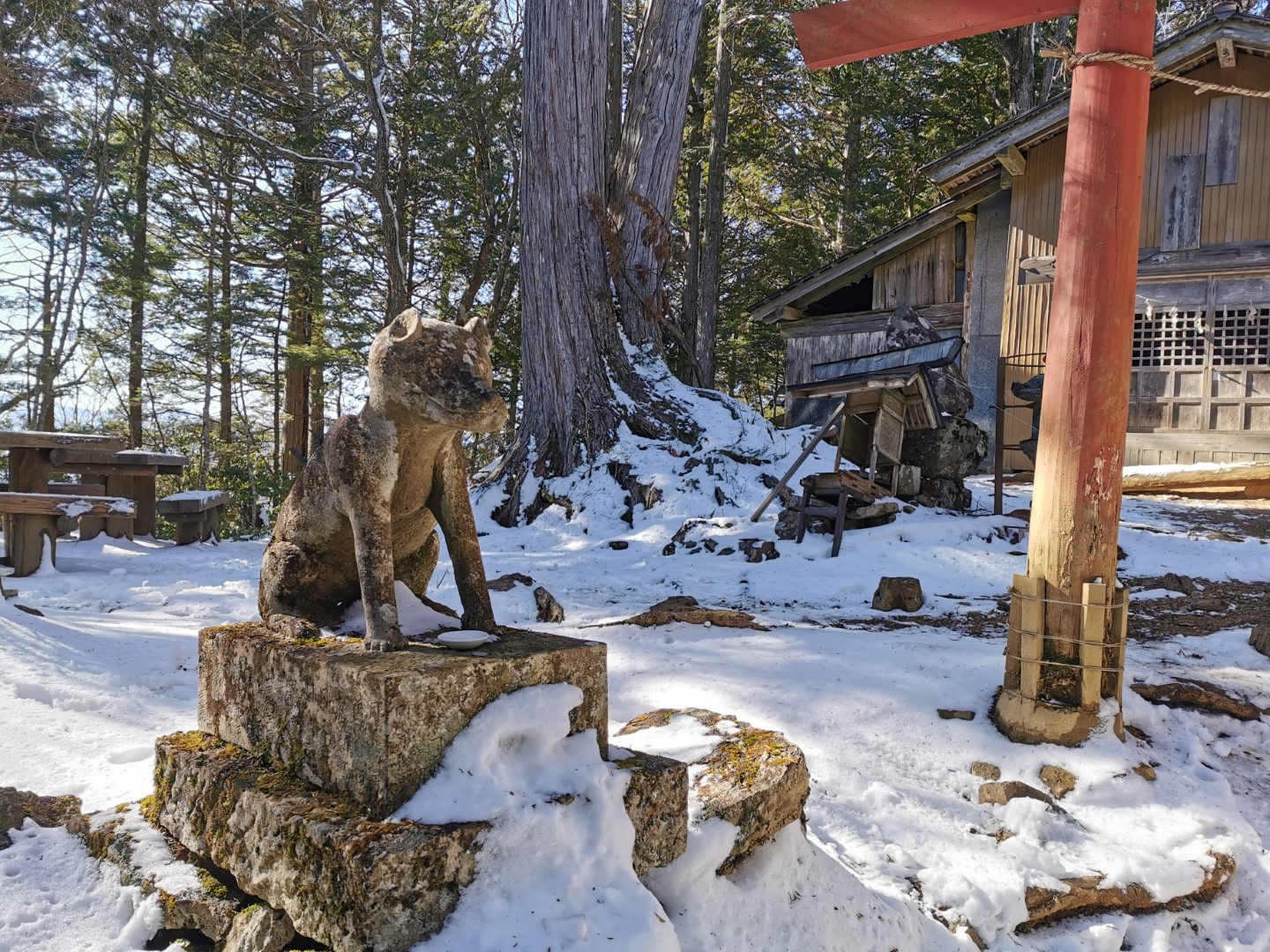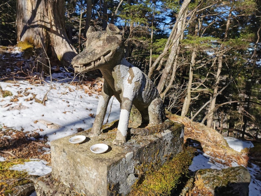 その赤い鳥居の横には、狛犬ではなく狼の石像が。ここ両神神社は山犬(ニホンオオカミ)を犬神として崇めているとのことで、なかなかおもしろいです。この鳥居の奥の建物にも別の狼の石像があり、思わずじっくりと見てしまいます。