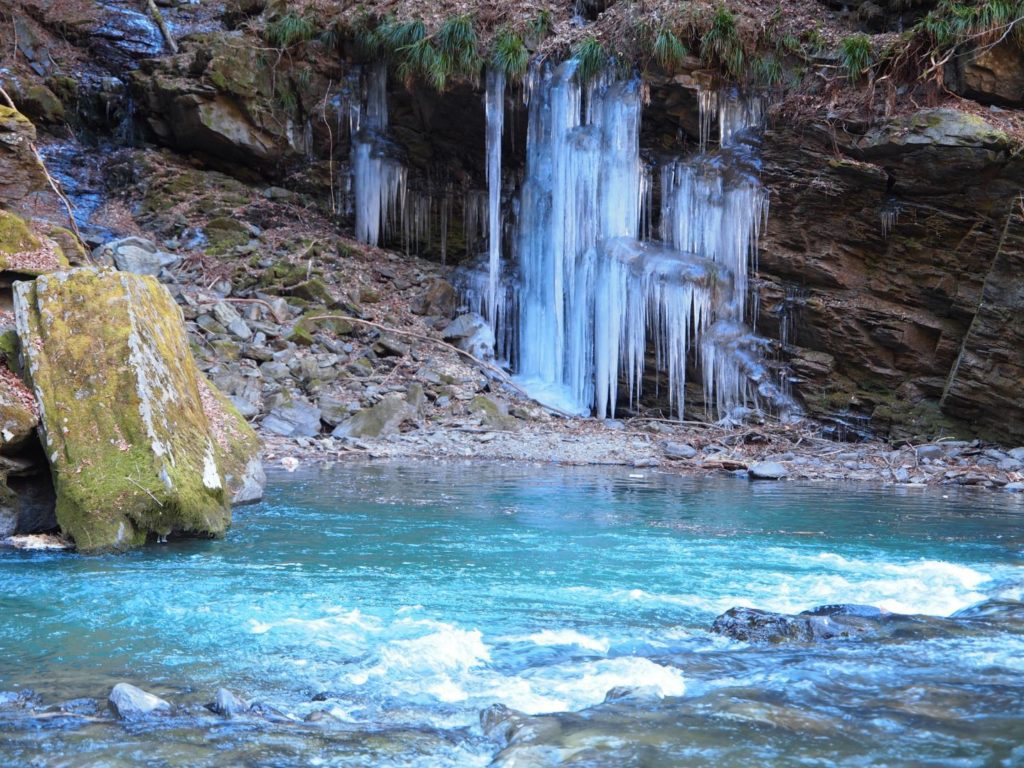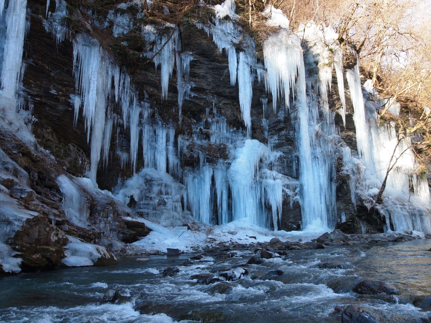 この日のメインは三十槌の氷柱。ここは天然の氷柱と人工の氷柱があって、一枚目の写真の手前側が天然のもので、その奥は人工的に作り出したもの。まず何よりその大きさと不思議な景観に驚く。人工のもののほうは相当な大きさなんだけど、手前の天然のものも、自然にこんな氷柱ができるのかと不思議なくらいの規模。翡翠色の川の色と真っ白な氷柱のコントラストも美しく、しばらくその場に立ち尽くしてすごいなぁと見上げるばかり。