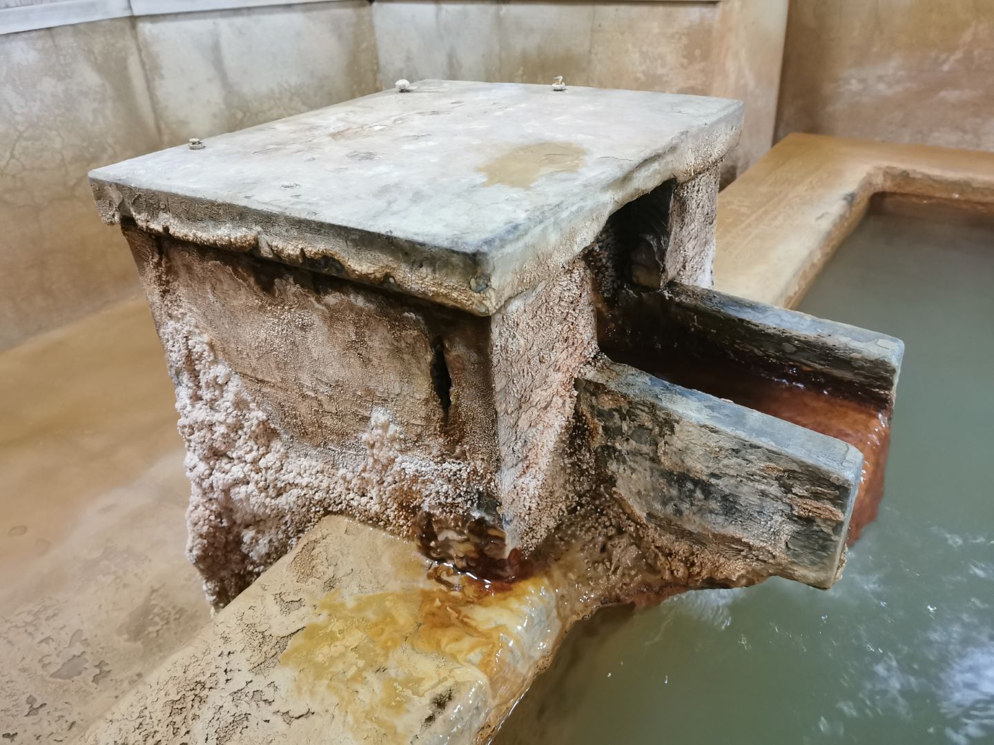 長生湯の泉質は含重曹土類泉。源泉の温度が 48度と(炭酸泉にしては)少し熱めだけど、成分を見ると高濃度の炭酸泉であることがよく分かる(いま見ていて気になったけど、硫酸が成分に含まれるんですね…)。湯船には緑褐色のお湯がなみなみと注がれていて、注ぎ口や床にはかなりの析出物がついていて温泉成分の濃さが感じられる。浴室全体には鉄分の匂いが結構する。長湯温泉は飲泉も薦められているのでちょっと飲んでみる、まぁまずい。また炭酸泉というと体にアワアワがつくのかなと期待してたけど、少し高めの温度のせいか泡がつくこともなく、飲んでみても微炭酸を感じることも無い。長湯温泉での湯治の場合は、大体 1日 200-1000cc くらい飲むってあるので結構な量だ。お湯自体は肌に少し絡みつくようなお湯で、肌をこするとキシキシと引っかかるような感じ。出たり入ったりを繰り返して、長く湯浴みを楽しめた。