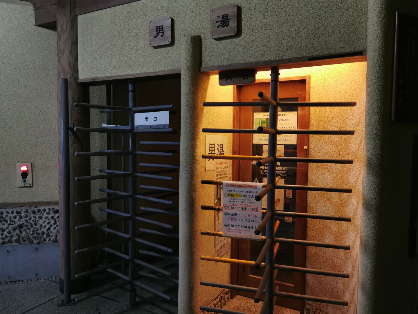 この時期、長生湯の裏手の川には鯉のぼりがかけられていて、なかなか良い雰囲気。夜だったこともあり誰もいなかったというのもあるけど、いきなり入り口の回転扉があって道入ってよいか悩む。よく見ると回転扉の向こう側にお金を入れる場所があるのだけど、入れると回転扉がきっちり回るのか、それとも何か別のことが起こるのかが良くわからない。とはいえ、迷ってても始まらないので指定される200円を入れてみる。すると、回転扉の向こう側の扉が横に動いた。おお、まさかそっちが自動扉(笑)。