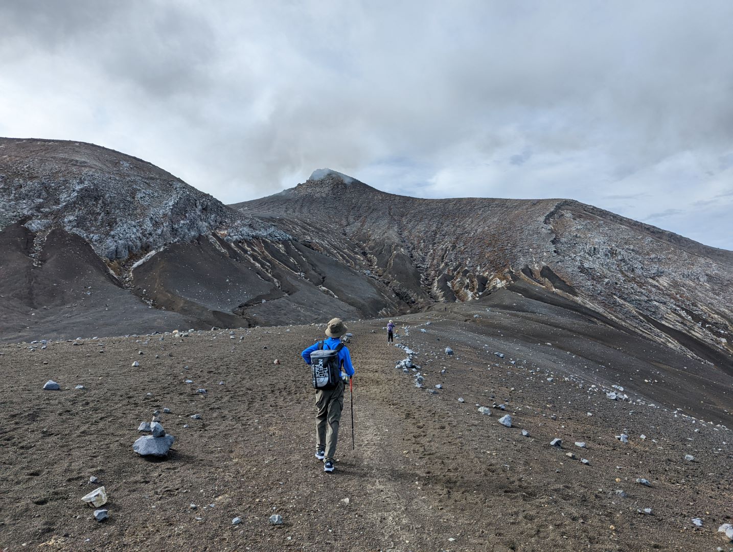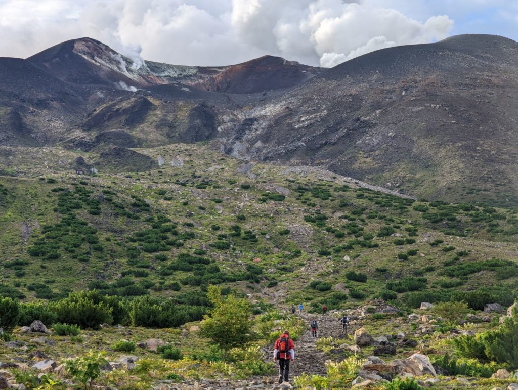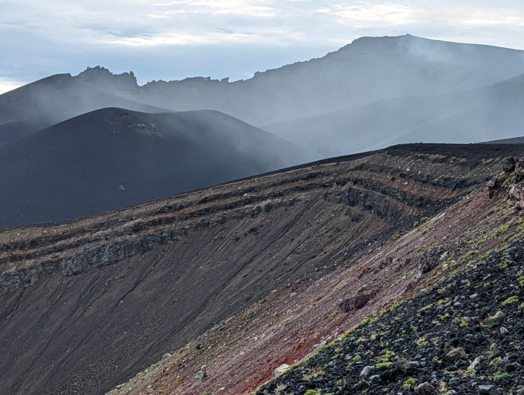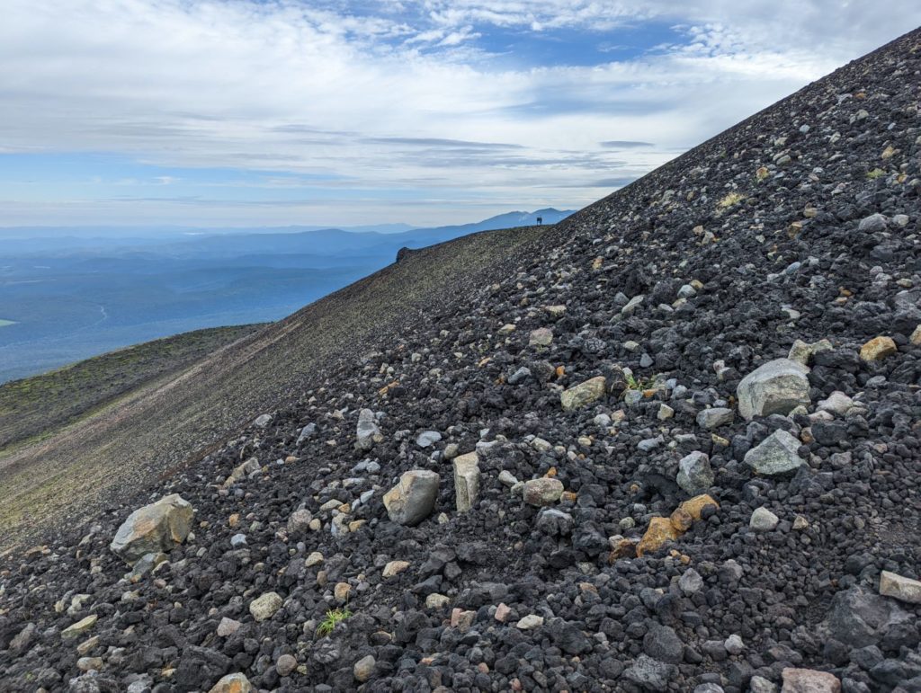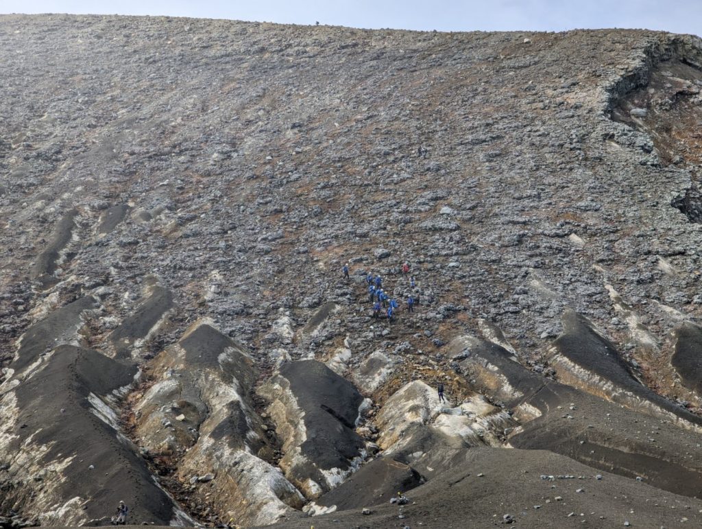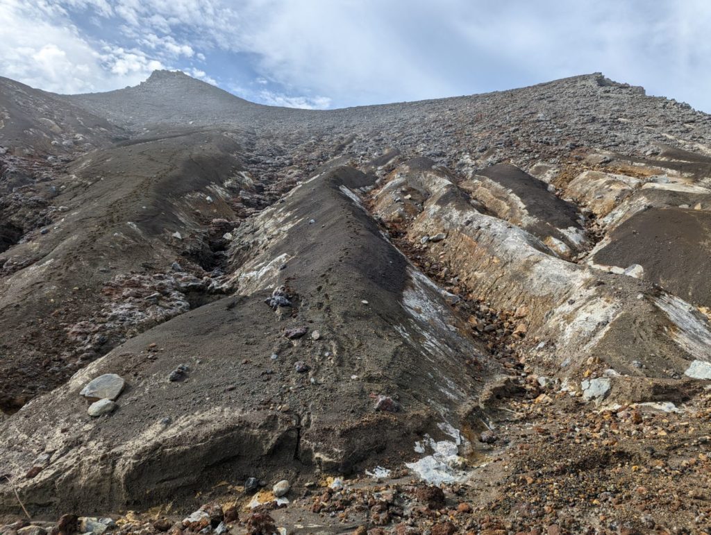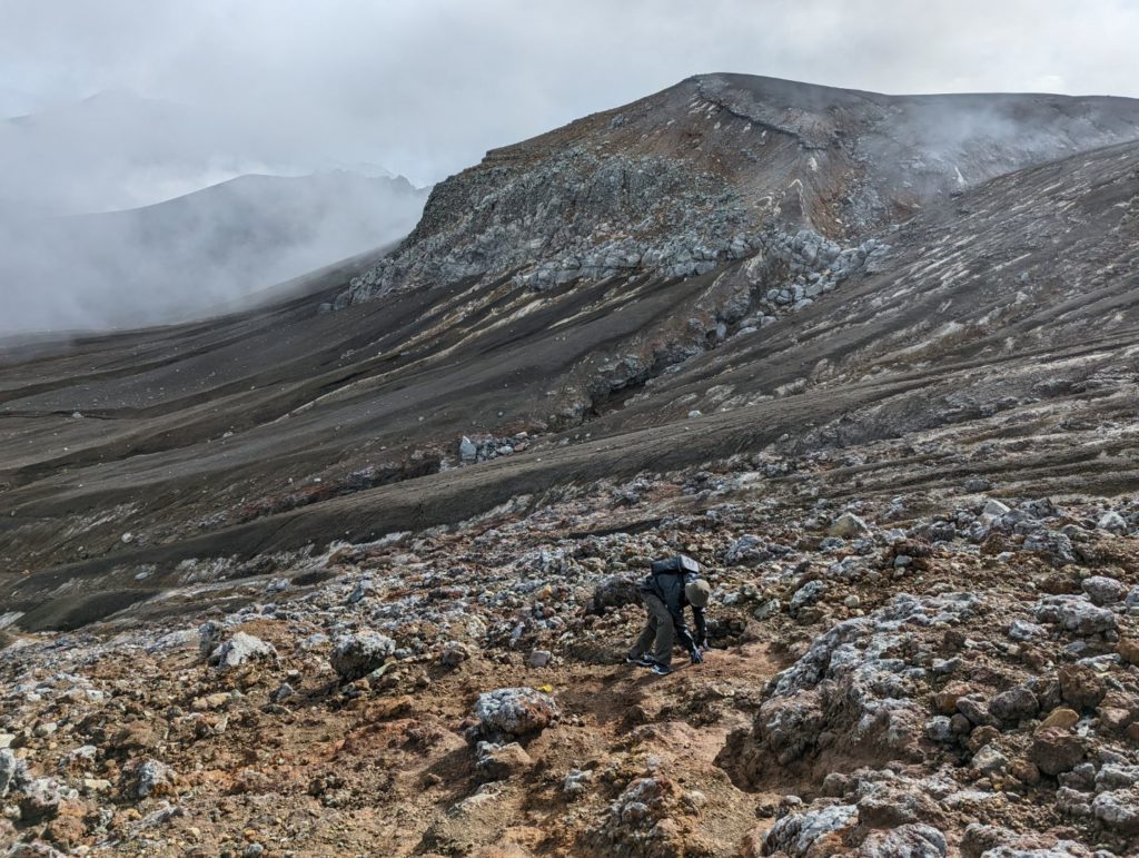 そこから先は、まるで異世界に足を踏み入れたような荒涼とした景色が広がり目を奪われるのだけど、一方で進行方向右手の火口から吹き上げる噴煙が風で流れてくると、火山ガスの匂いが凄くて咳き込んでしまう。今日はまだそれほどでも無かった気はするけど、条件が悪いとここは登りきれないかもしれない。また、ここまでにそれなりの急登をこなしてきたのだけど、今一度目の前に壁みたいな上りが突然現れることもあって、ここは結構気持ち的にも頑張りどころ。