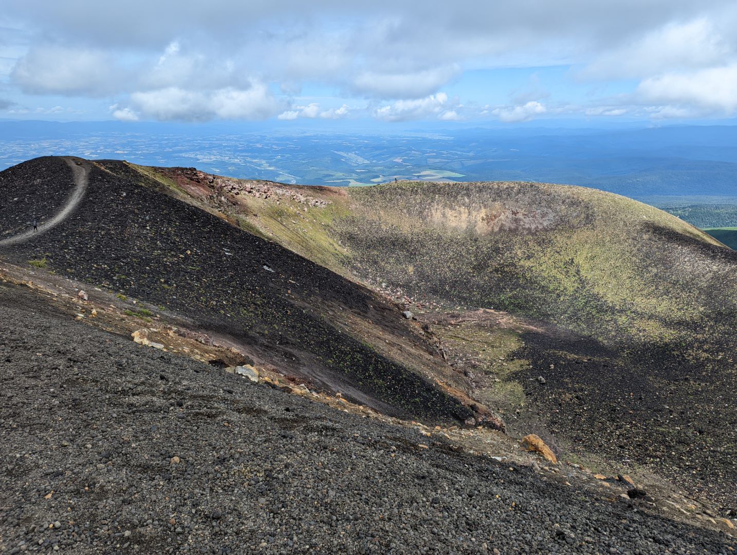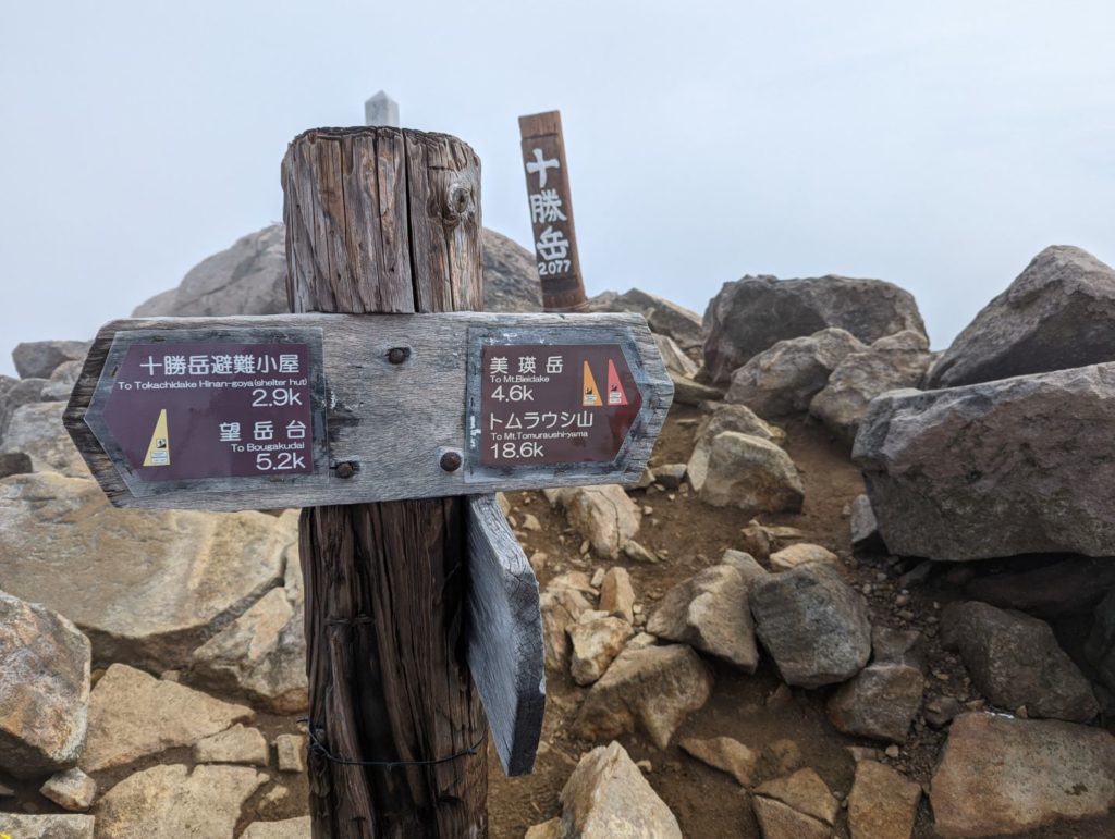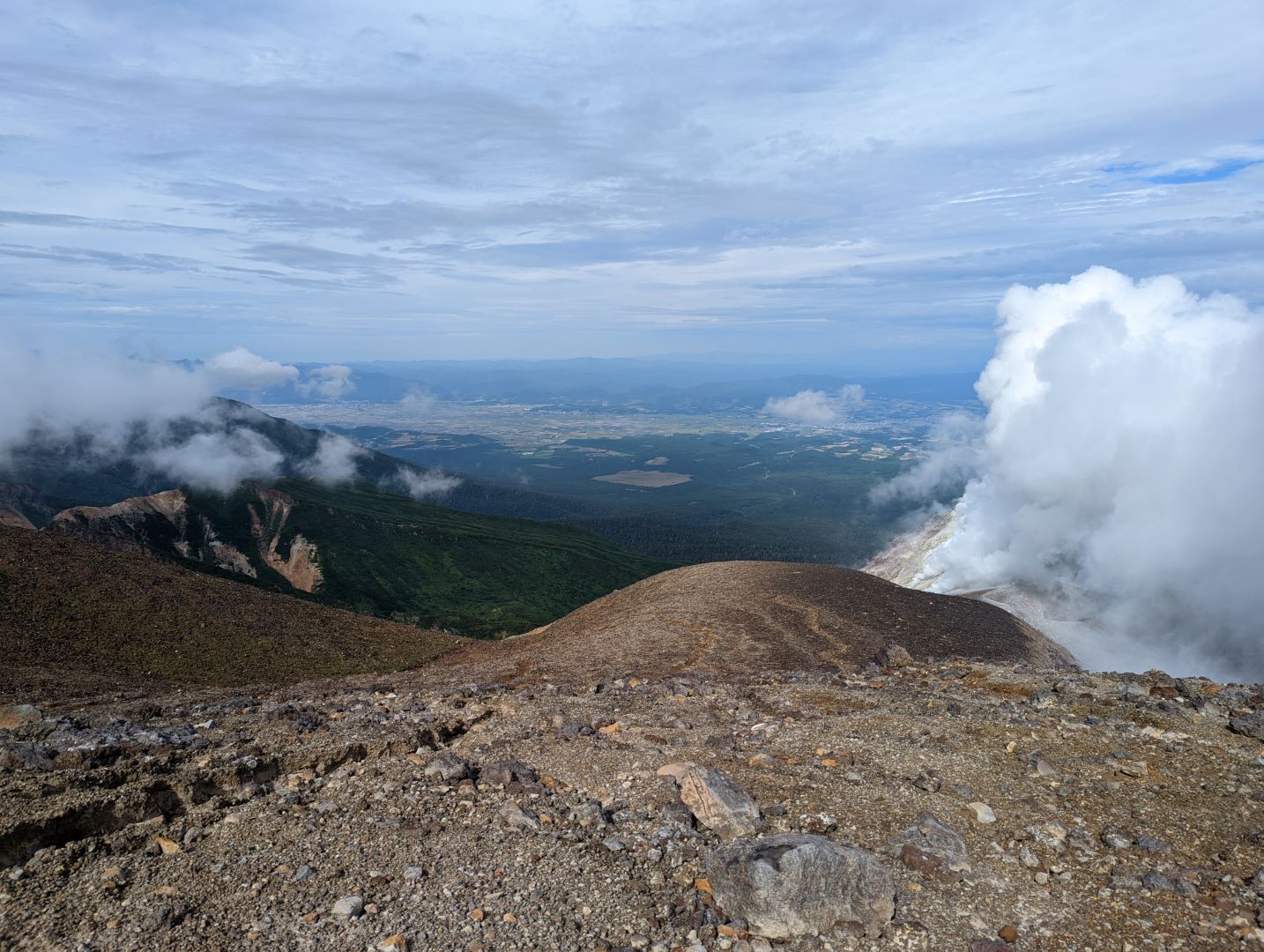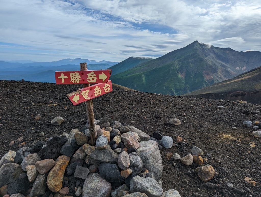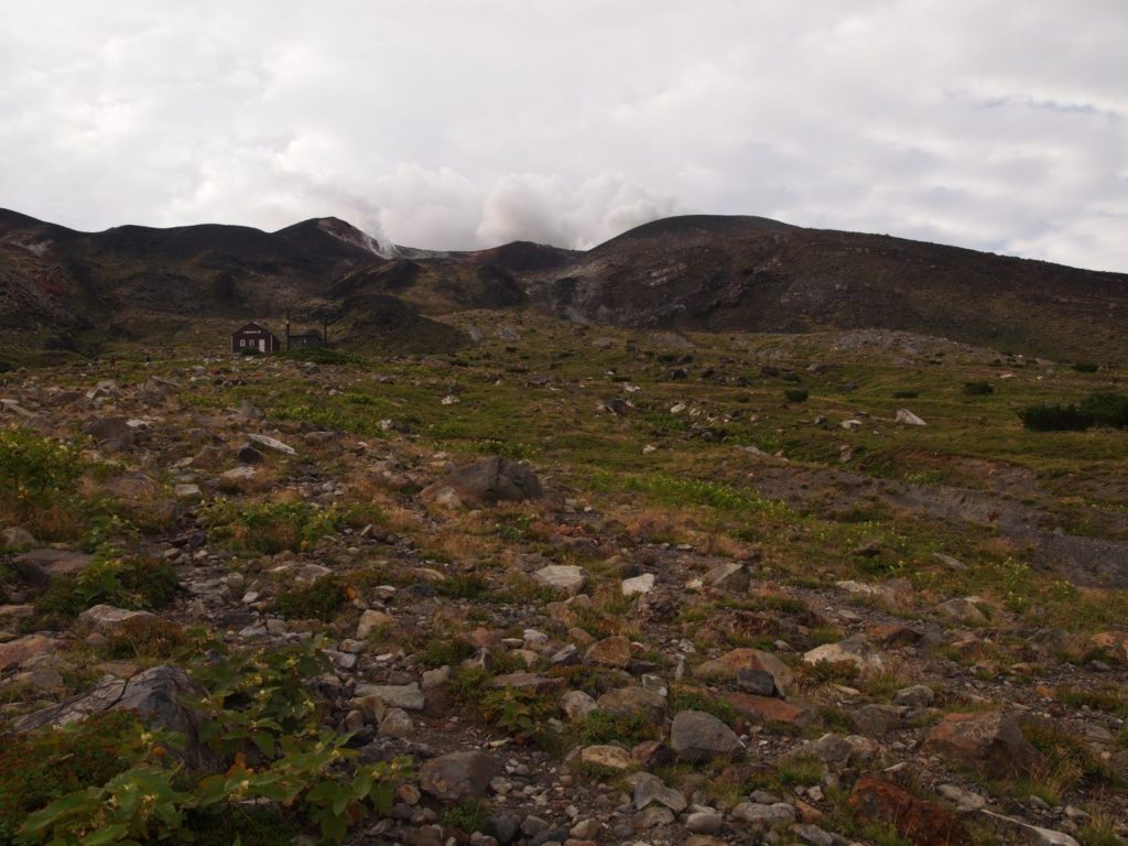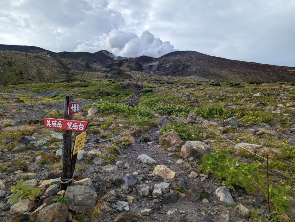 そこから先は、まるで異世界に足を踏み入れたような荒涼とした景色が広がり目を奪われるのだけど、一方で進行方向右手の火口から吹き上げる噴煙が風で流れてくると、火山ガスの匂いが凄くて咳き込んでしまう。今日はまだそれほどでも無かった気はするけど、条件が悪いとここは登りきれないかもしれない。また、ここまでにそれなりの急登をこなしてきたのだけど、今一度目の前に壁みたいな上りが突然現れることもあって、ここは結構気持ち的にも頑張りどころ。