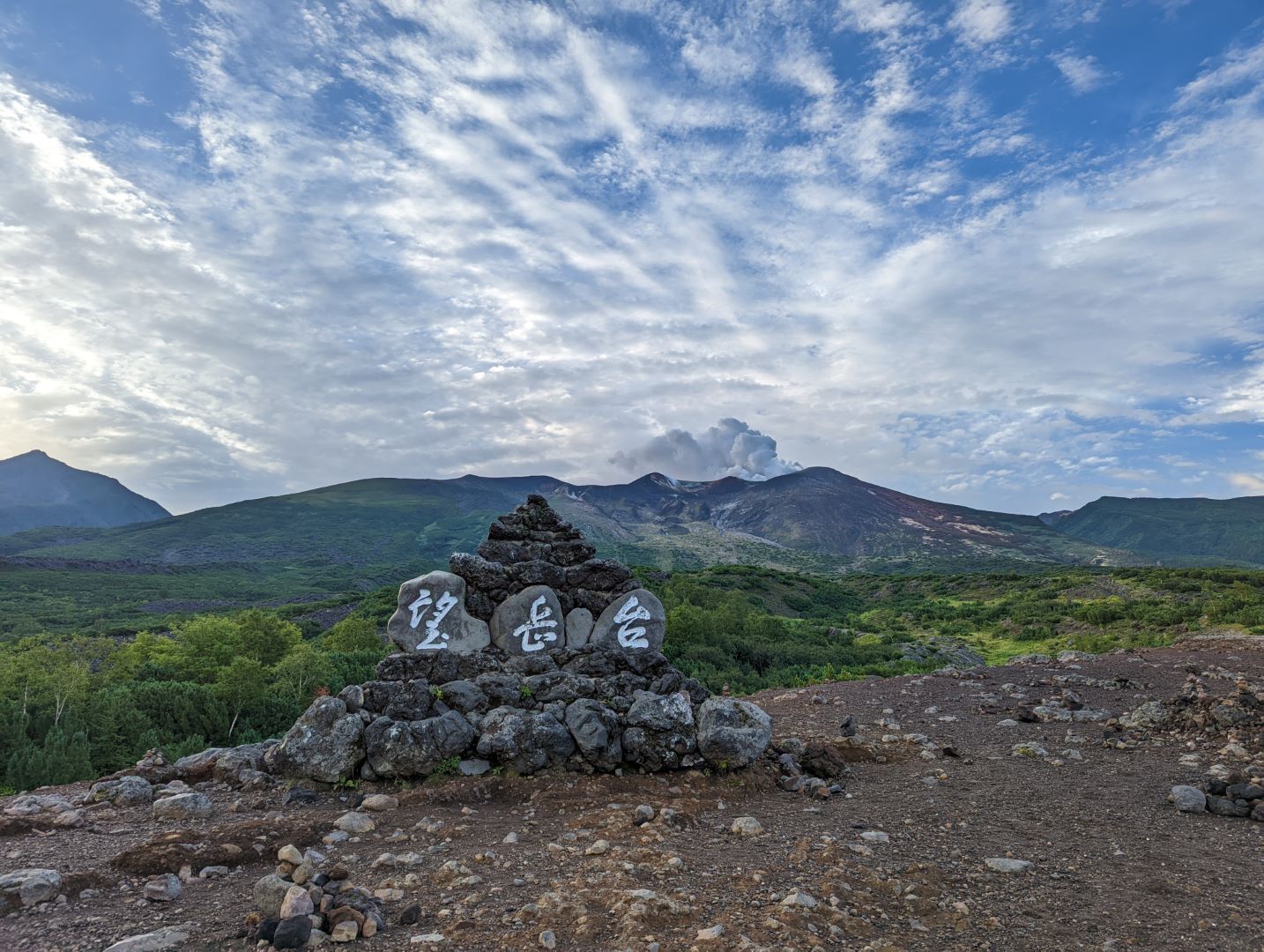 今回の十勝岳登山は望岳台からの往復。美瑛岳を含む周遊も考えたけど、8-9時間近くになる登山は、登山をいつもやっているわけではない子供には流石にちょっと厳しいので。朝暗いうちから東川町を出発して、望岳台に到着した頃にはいい感じに明るくなりひんやりした空気が気持ちが良い。幸いまだ駐車場もいっぱいでは無かった。避難小屋までは基本緩やかな上り、正面にもくもくと噴煙を上げる十勝岳を見ながらガレ場の道をどんどん登っていく。