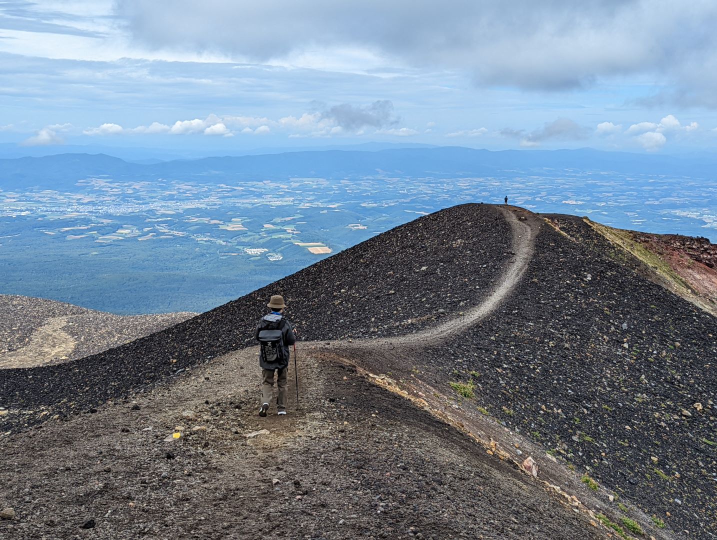 しばらく登ると美瑛岳の美しい山容が見えてきて、さらにスリバチ火口というその名の通りの形状をしたきれいな火口が見えてくる。実に素晴らしい眺めで写真をバンバン撮っていると、子供から早く進もうと呆れられる。