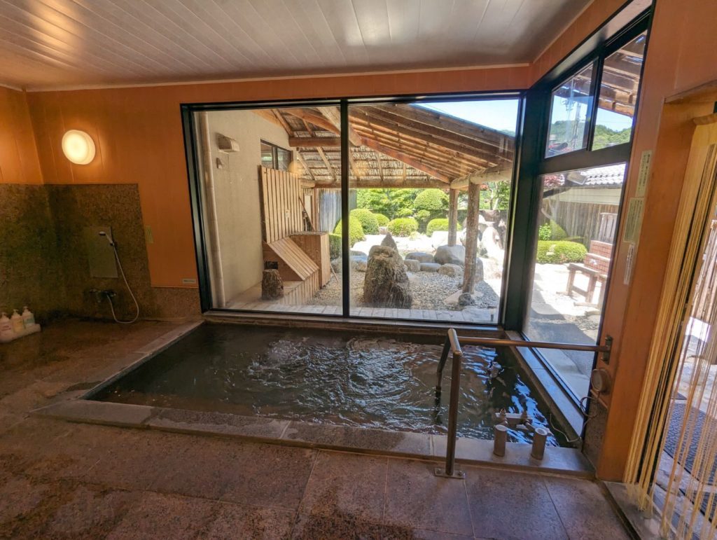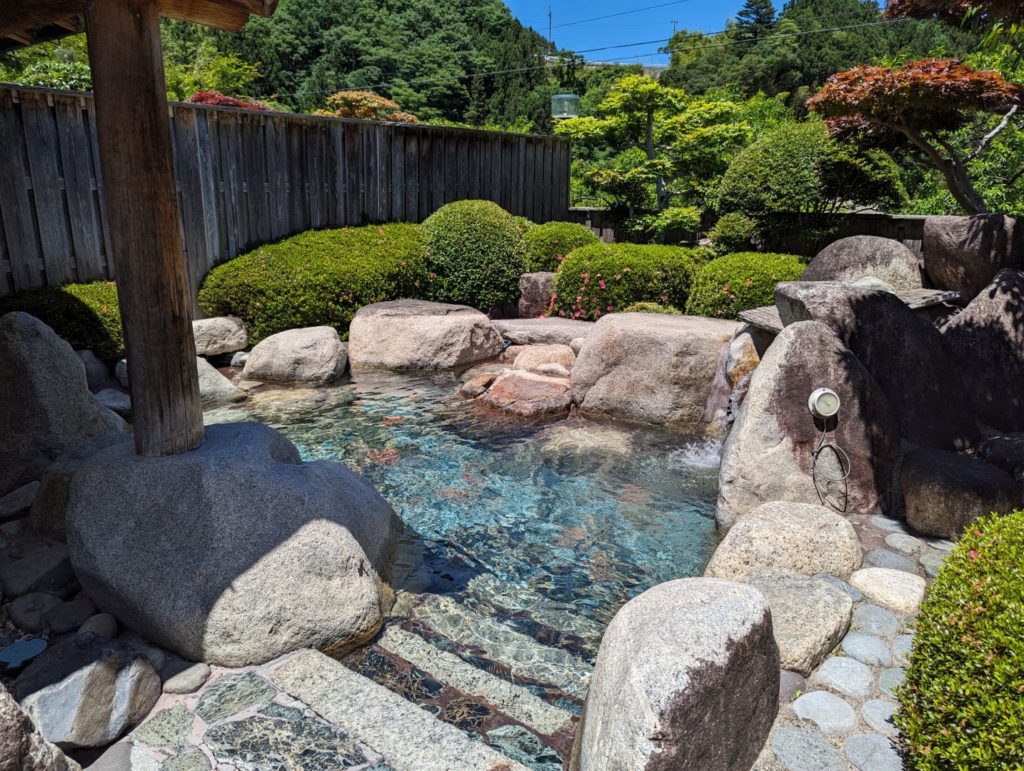 開放的で緑が眩しい露天風呂では、かろうじて休憩用に作られたスペースの屋根の影がかかっていたこともあって、一人でのんびり。いい頃合いだなと出ようとしたところで、登山客がどさっと入ってきたのでほんとにラッキーだった。
